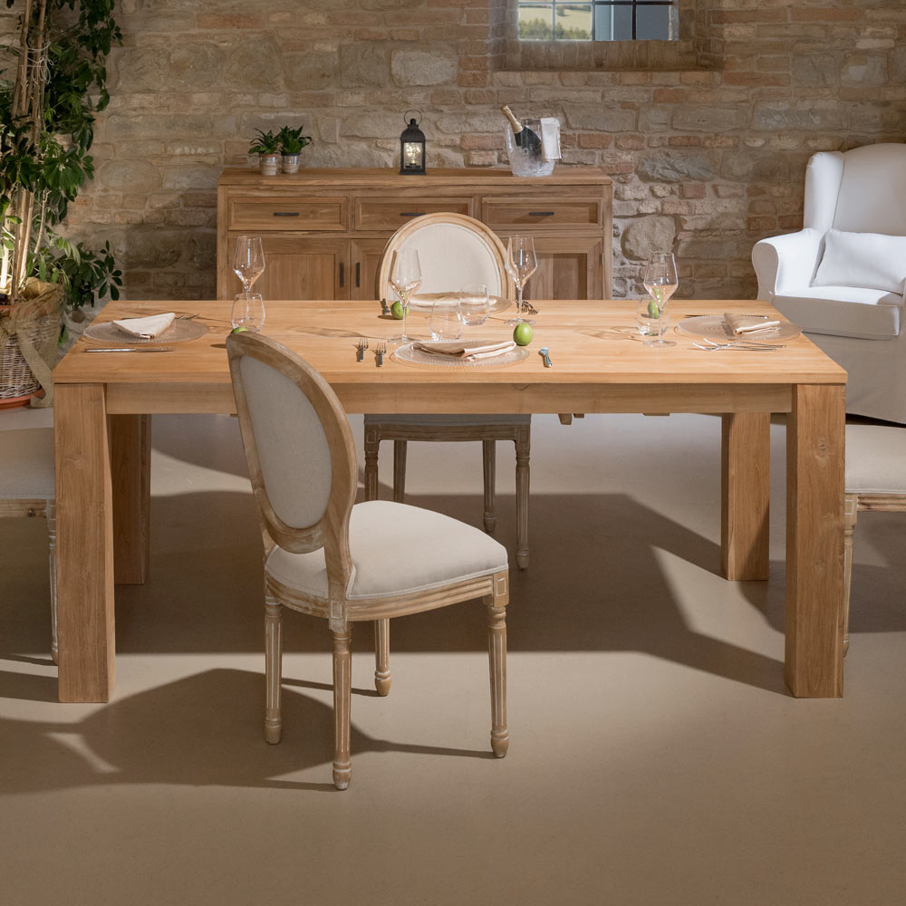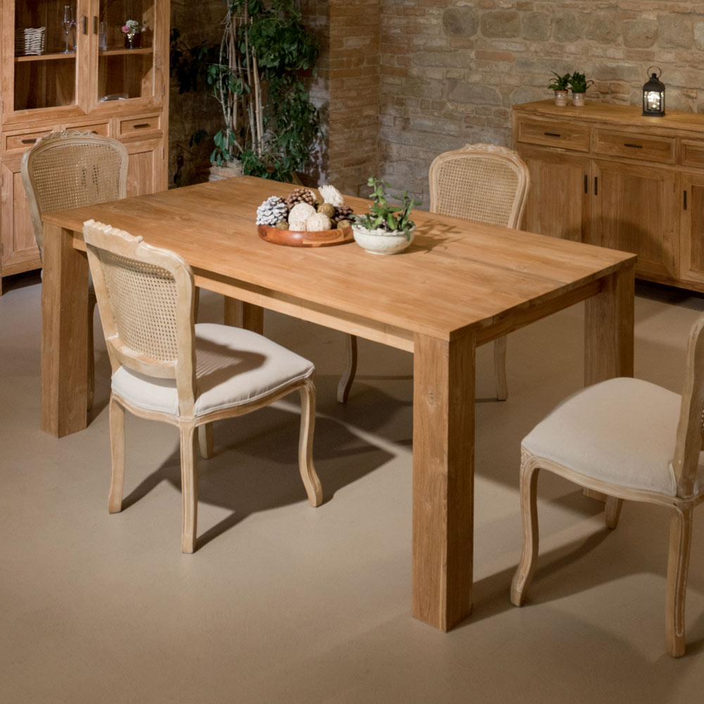 Ten solidny, stały stół z drewna tekowego to solidny i elegancki mebel, idealny do dodania stylu Twojej jadalni lub kuchni. Solidna konstrukcja i kunszt wykonania podkreślają naturalne usłojenie drewna , tworząc ciepłą i przyjazną atmosferę.