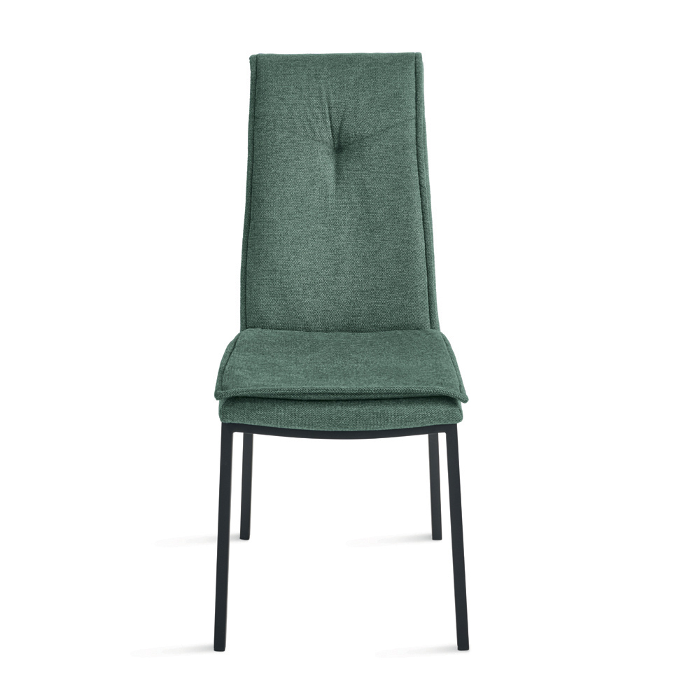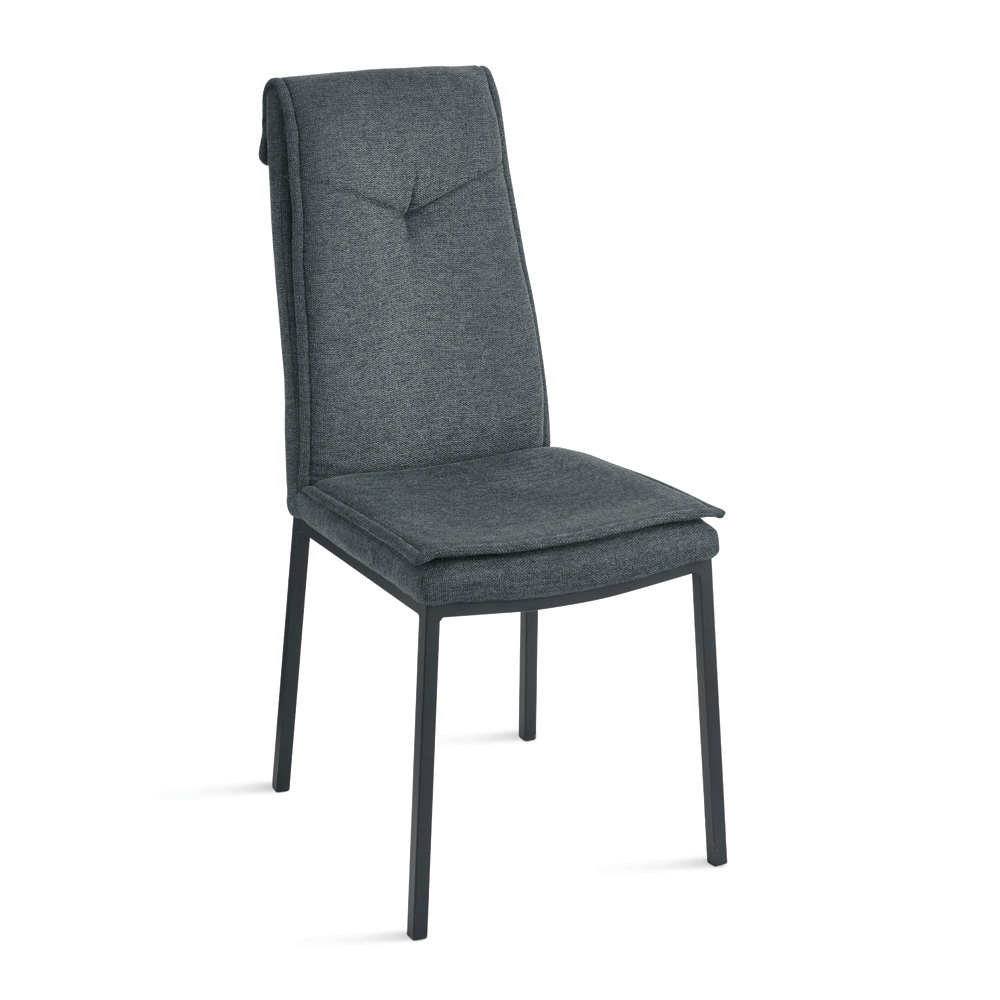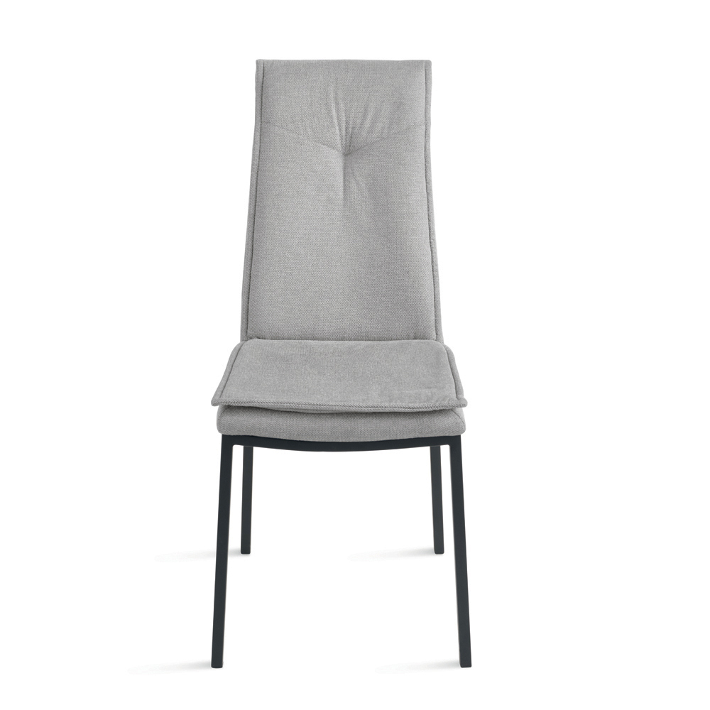 Krzesło charakteryzuje się smukłą sylwetką i wysokim oparciem , które zapewnia lepsze podparcie pleców i ramion, gwarantując wygodę siedzenia nawet podczas długich godzin przy stole. Wyściółka ozdobiona jest ozdobnymi przeszyciami w środkowej części górnej części oparcia, co stanowi elegancki detal podkreślający design siedziska.