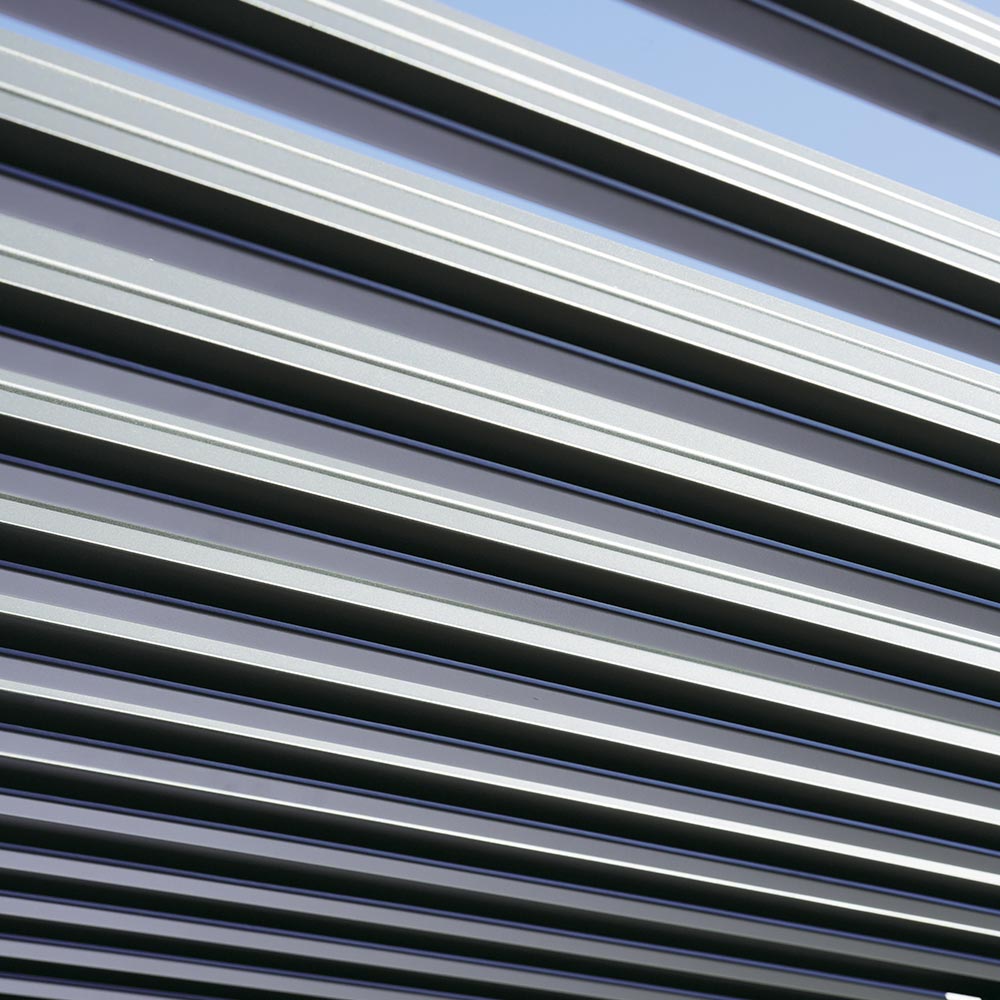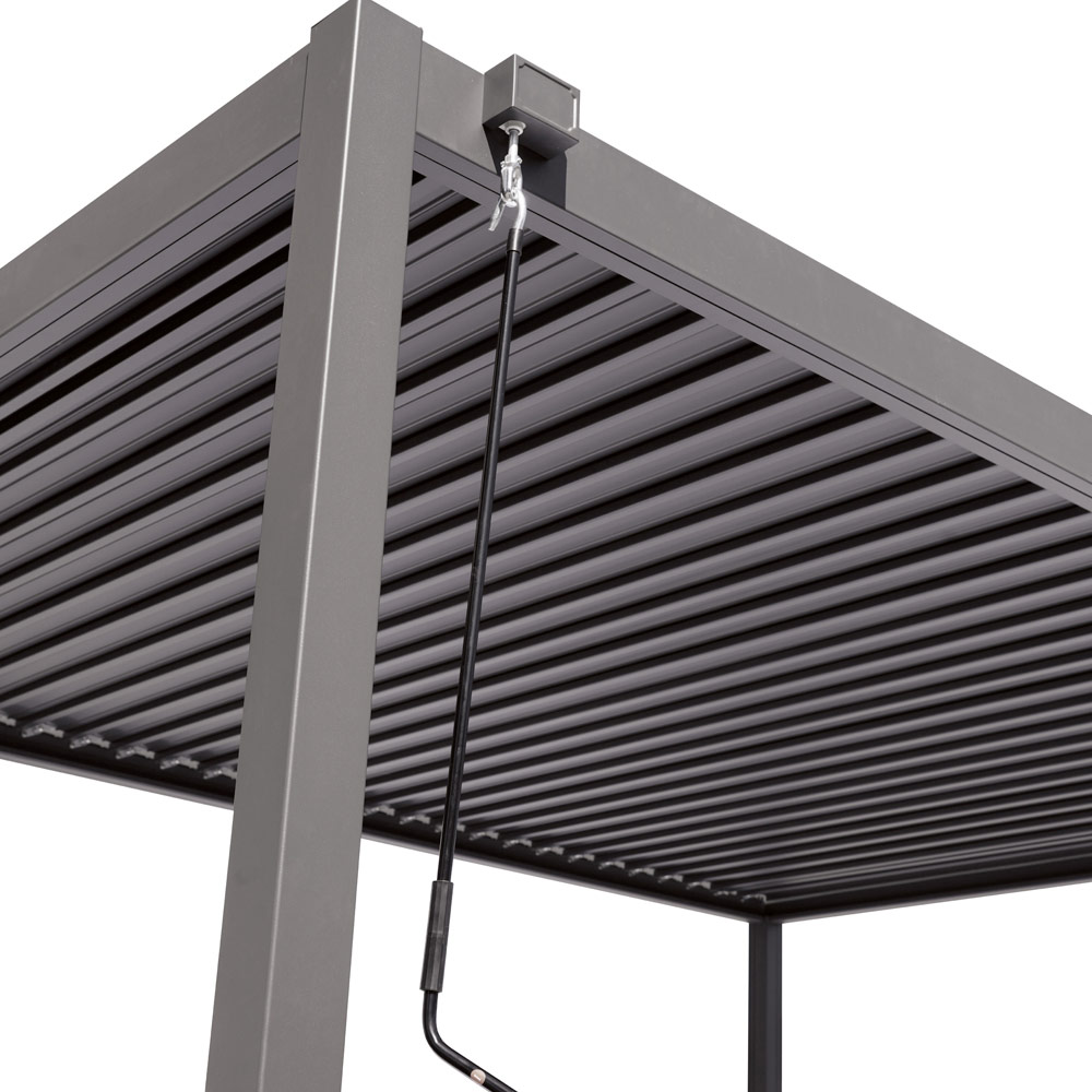 Aluminiowe słupki nośne o wymiarach 90 x 90 mm i poprzeczki dachowe o wymiarach 120 x 30 mm / 147 x 30 mm zapewniają solidną i niezawodną konstrukcję. Regulowany dach żaluzjowy , obsługiwany za pomocą zewnętrznej stalowej korby , pozwala na łatwą regulację wlotu światła i wentylacji, tworząc idealne warunki o każdej porze dnia.