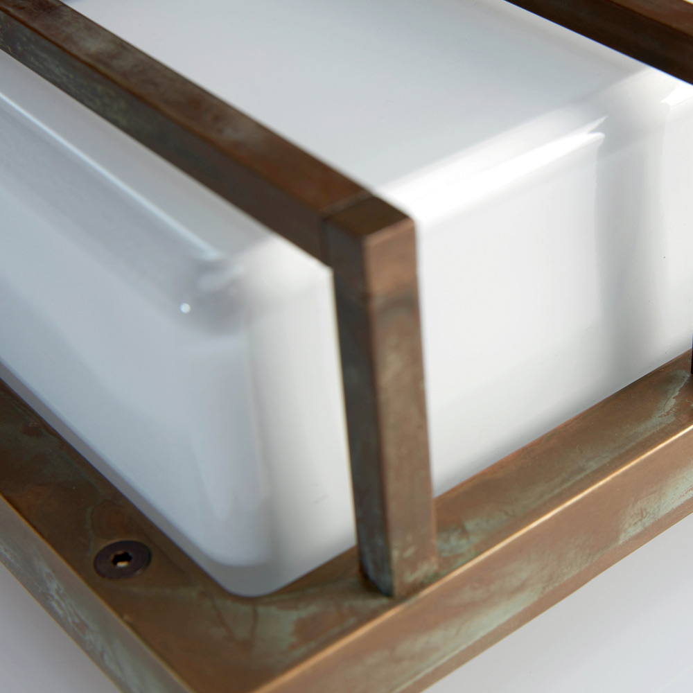 Prosty i elegancki, ten ręcznie wykonany kinkiet to wyrafinowane rozwiązanie oświetleniowe, zaprojektowane z myślą o podkreśleniu nowoczesnych ścian i nowoczesnych przestrzeni. Odlewana mosiężna konstrukcja w połączeniu z prostokątnym opalowym kloszem ze szkła tworzy miękkie, równomierne światło, idealne do oświetlenia gościnnego i funkcjonalnego.