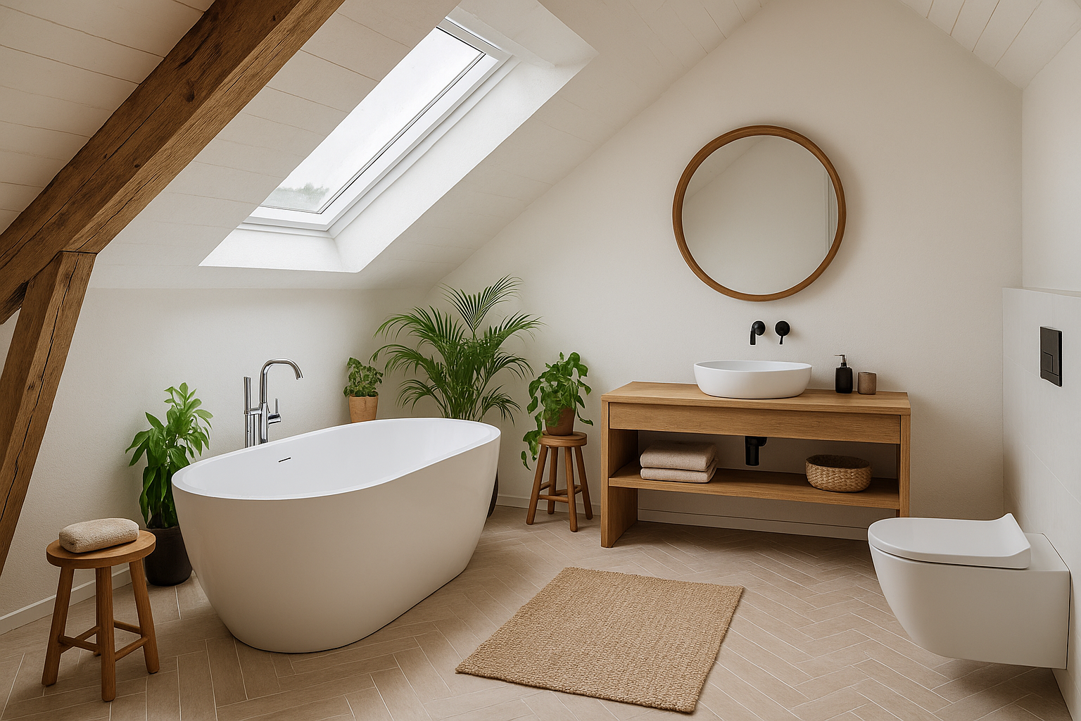Na poddaszu najważniejsze jest światło . Jeżeli masz świetlik, wykorzystaj go maksymalnie. Ale gdzie jest prawdziwy styl? Warstwowy system oświetlenia. Pomyśl o lampach ściennych z mosiężnymi ramami , ręcznie wykonanych we Włoszech, które tworzą ciepłe i przyjazne odbicia światła. Tak, nawet w łazience.