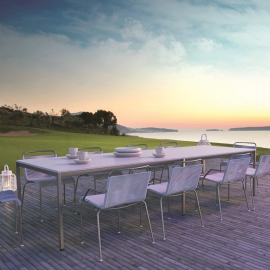 A na niezapomniane i magiczne śniadanie, lunch lub kolację w ogrodzie oferujemy szeroki wybór stołów ze szklanym lub ceramicznym blatem, prostokątnym, okrągłym lub owalnym w połączeniu z krzesłami skoordynowanymi z projektem ulubionego stołu.
