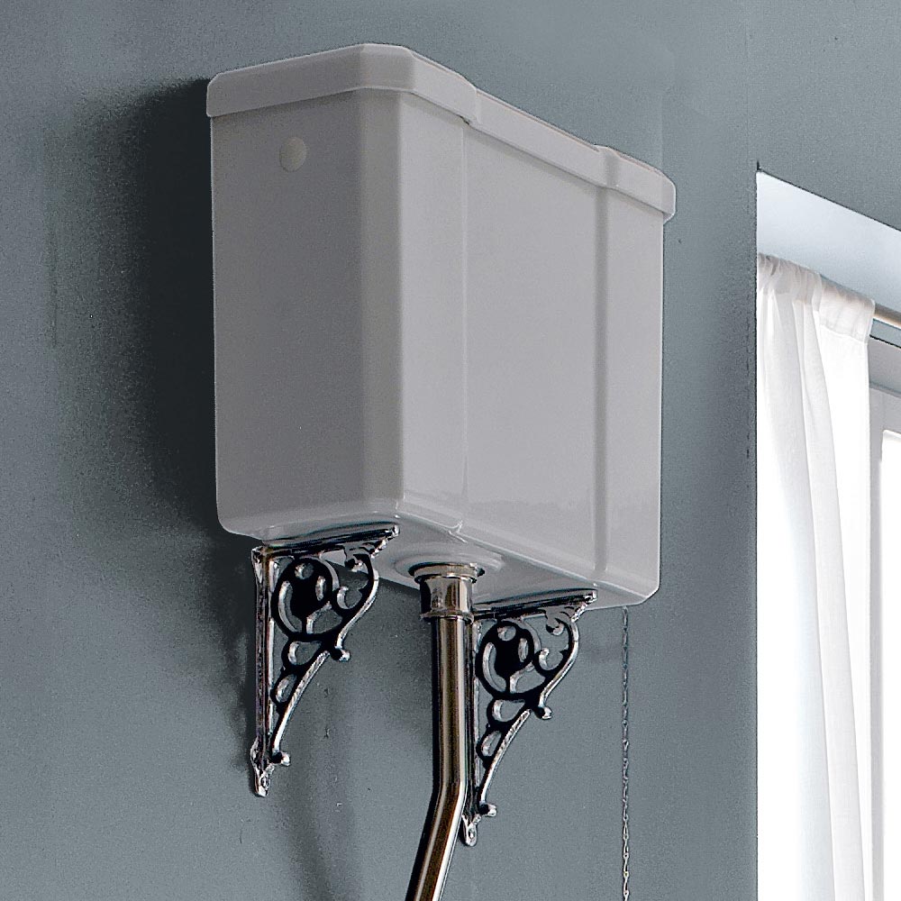 Toaleta podłogowa w klasycznym stylu z wysoką białą ceramiczną skrzynką Marwa, wyprodukowana we Włoszech.