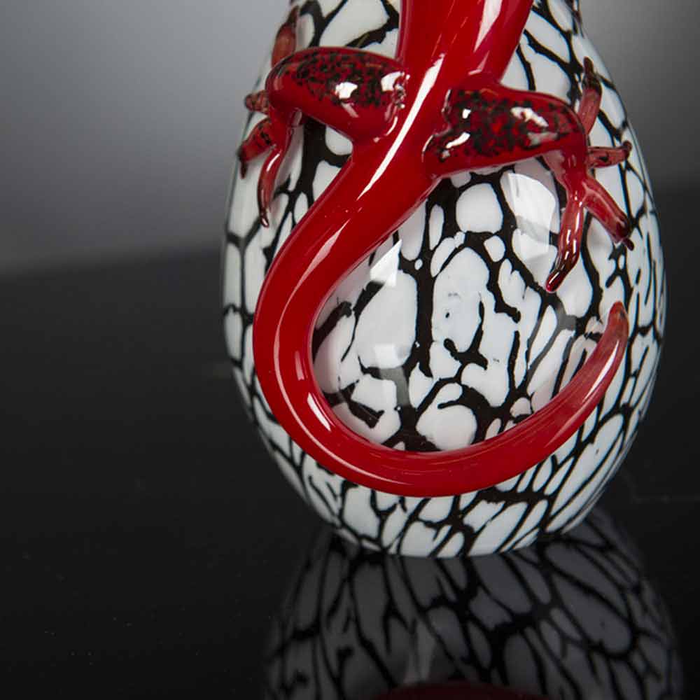 Posąg w kształcie jajka z gekonem wykonany we Włoszech ze szkła białego, czarnego i czerwonego . Ekscentryczny element dekoracyjny do przestrzeni domowych, który dzięki swojej silnej osobowości twórczejmoże nadać oryginalny charakter. Jego niezwykła i kolorowa estetyka niewątpliwie stanowi jego mocną stronę, co czyni go idealnym pomysłem dla tych, którzy uwielbiają wzbogacać domowe otoczenie w oryginalny i jednocześnie elegancki sposób dzięki przedmiotowi podkreślonemu ekskluzywnymi liniami i ponadczasową elegancją szkła i jego cudowne kolory. Rezultatem jest prosty dekoracyjny dodatek do domu, który dzięki swojej nowoczesnej duszy i awangardowemu wzornictwu może wzbogacić styl każdego domu o odrobinę koloru .
