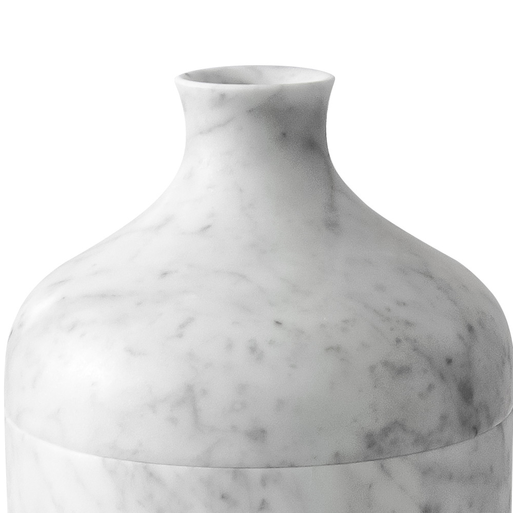 Ten dekoracyjny wazon ma rzemieślniczy i luksusowy design podzielony na 3 części, w całości wykonany z satynowego białego marmuru Carrara.