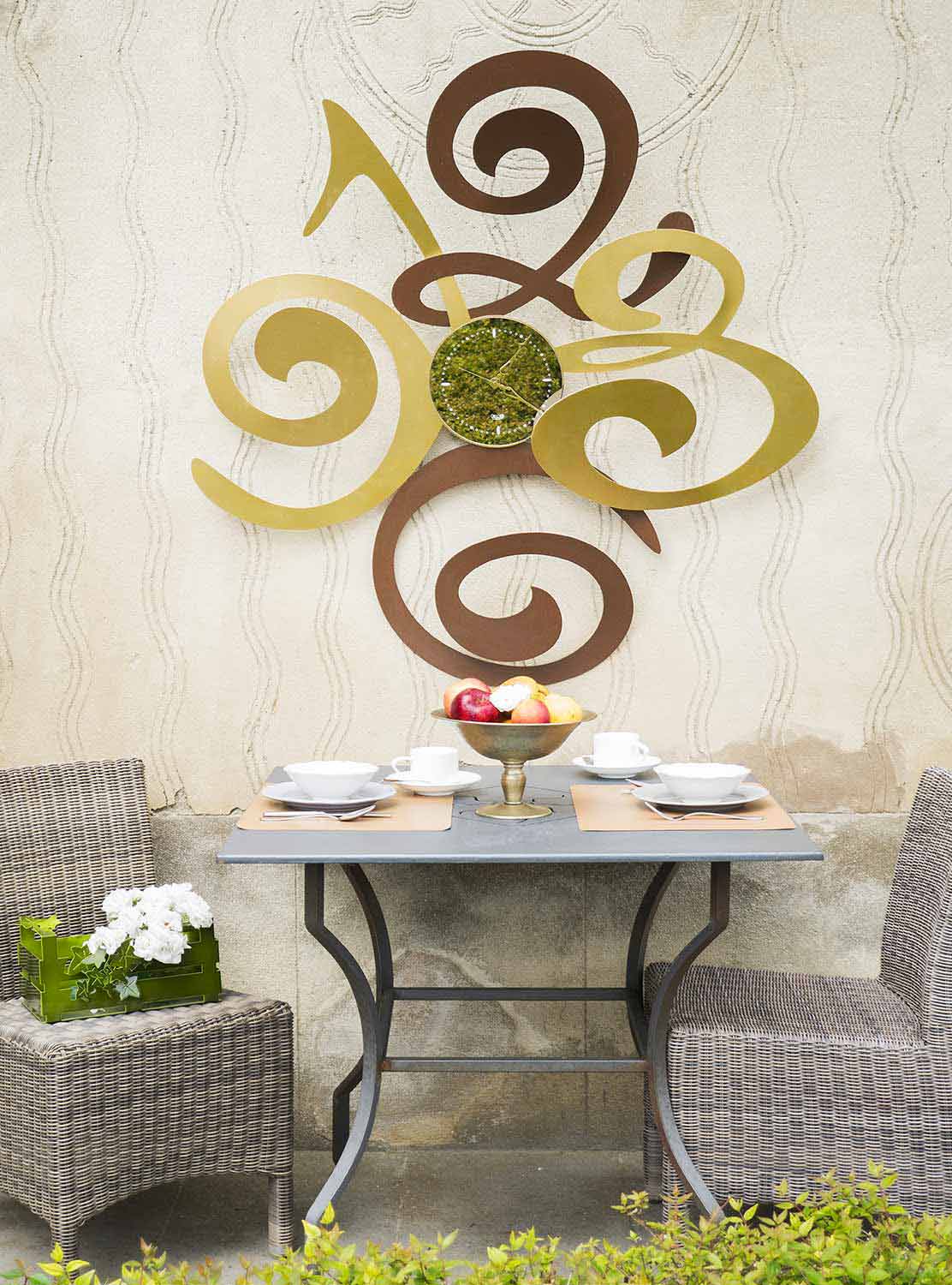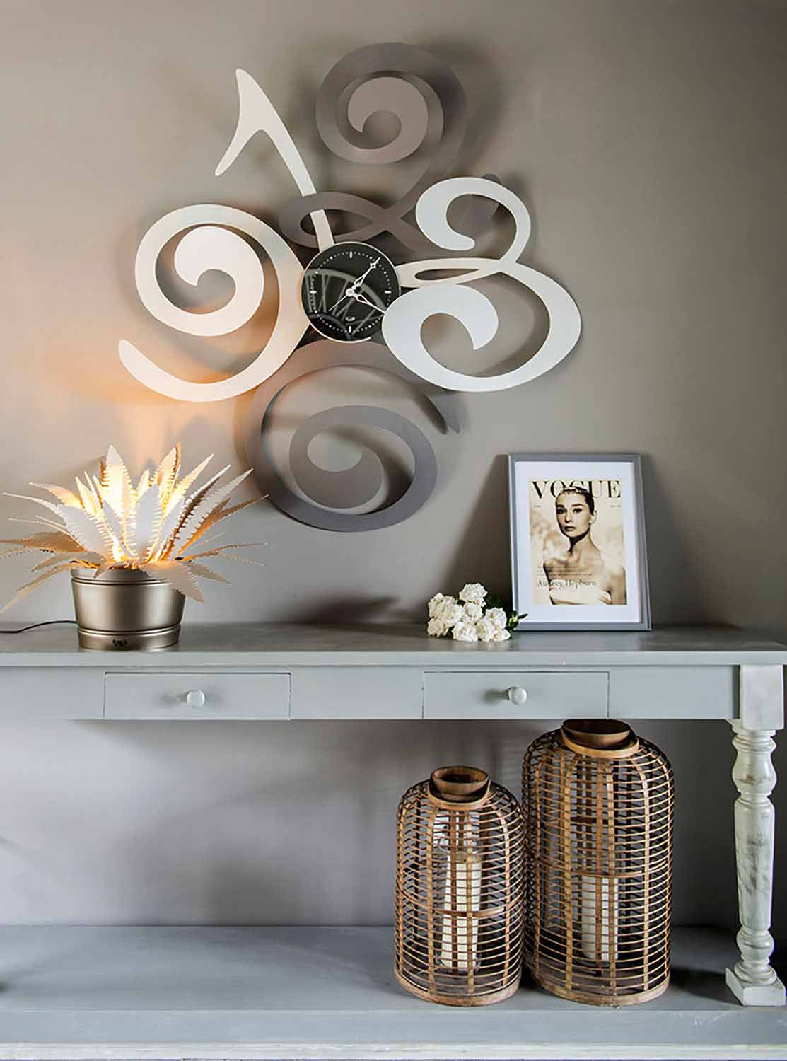 zegar ścienny z zaokrąglonymi liniami w kształcie loków oraz wyrafinowanym i eleganckim designem.