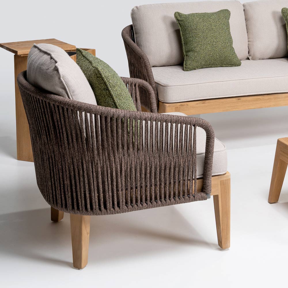 Fotel zewnętrzny z drewna tekowego i splotu polietylenowego z poduszkami.