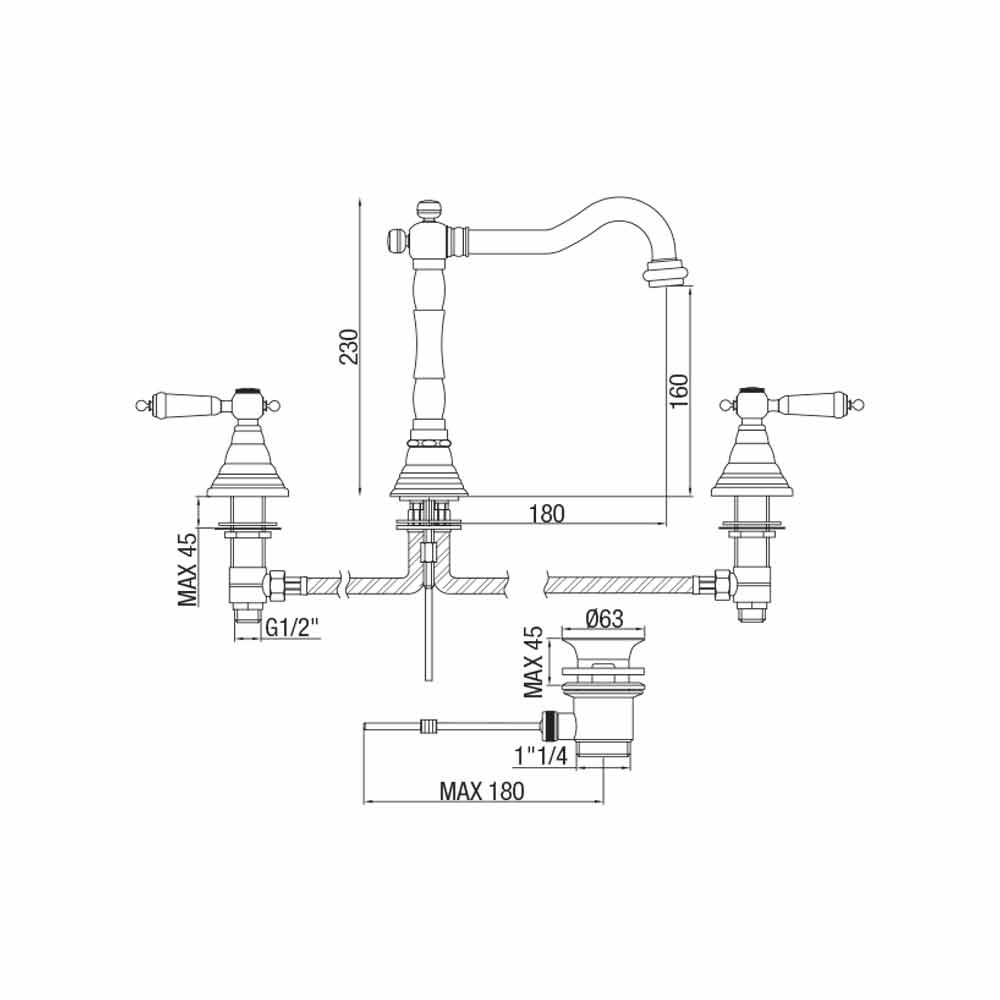 Klasyczna, mosiężna bateria umywalkowa z 3 otworami Made in Italy.