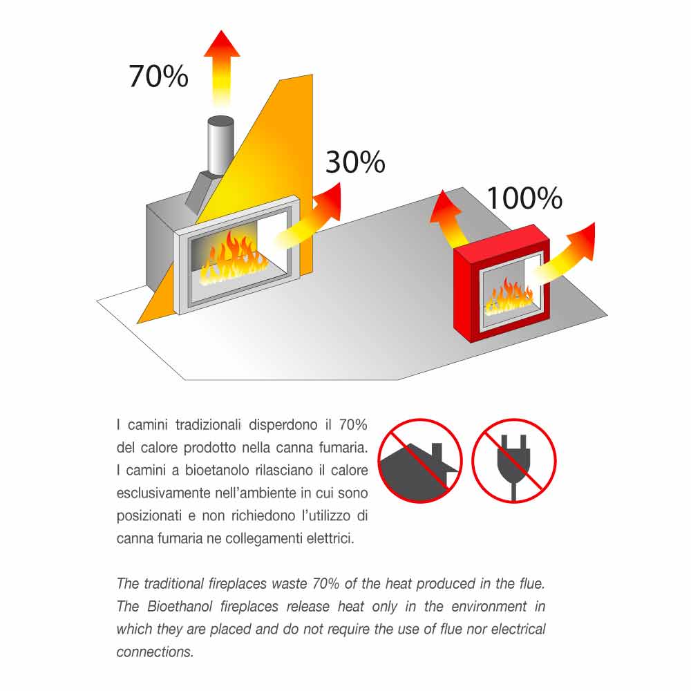 Co więcej, w przeciwieństwie do tradycyjnych kominków, które rozpraszają 70% ciepła wytworzonego w przewodzie kominowym, w kominkach na bioetanol, ponieważ nie ma przewodu kominowego ani połączeń elektrycznych, nie występuje rozpraszanie ciepła, a zatem ich sprawność wynosi 100%.