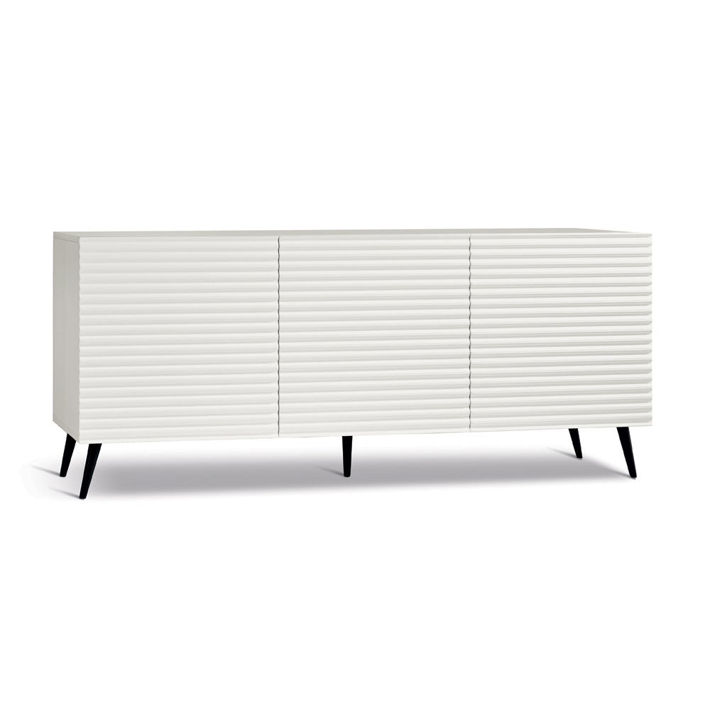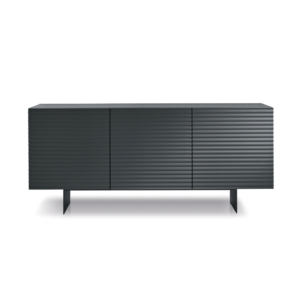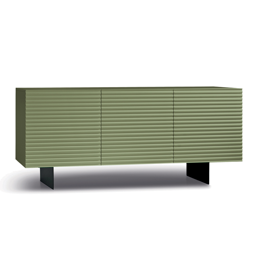 Designerska komoda wykonana we Włoszech z tłoczonymi, paskowanymi drzwiami i malowaną metalową podstawą
