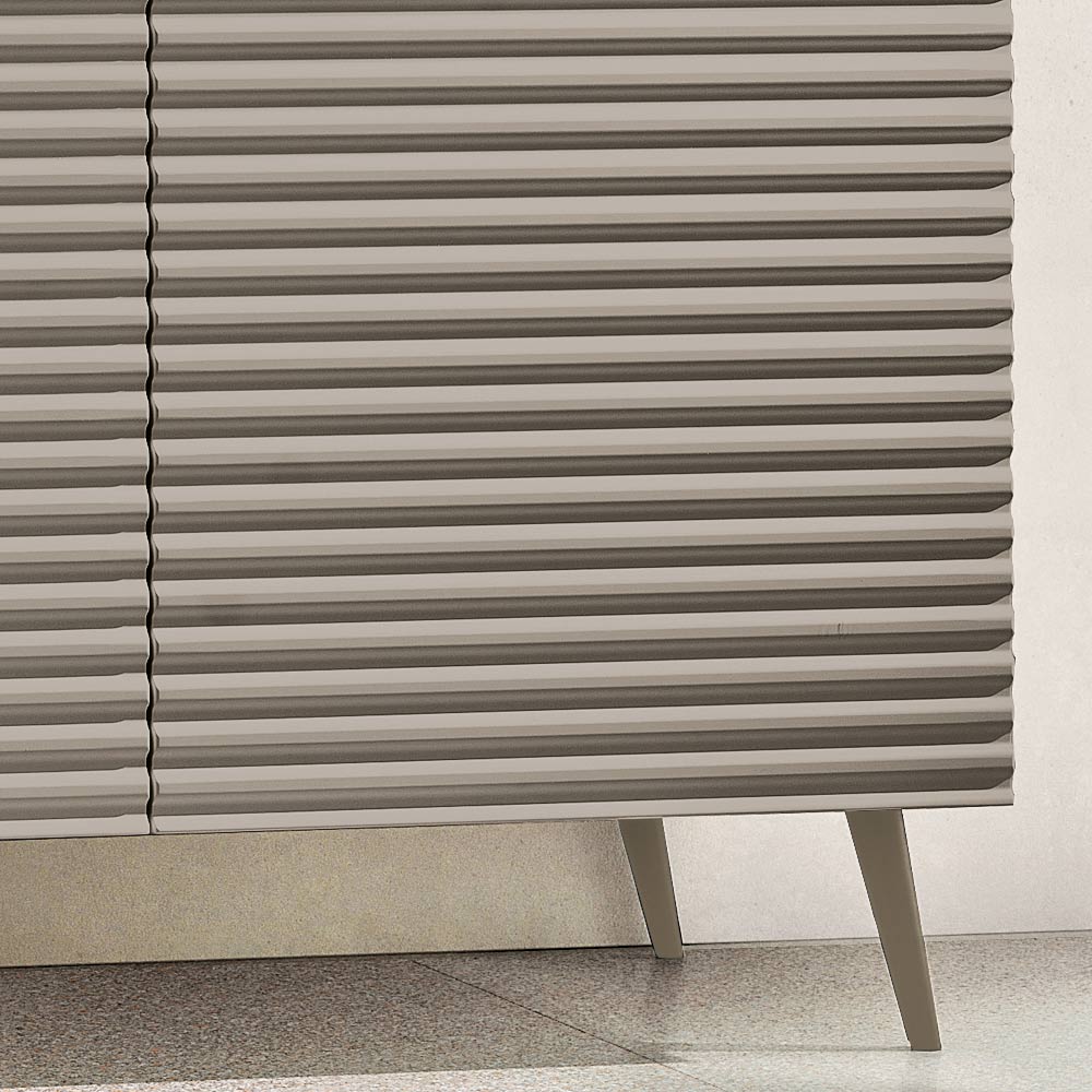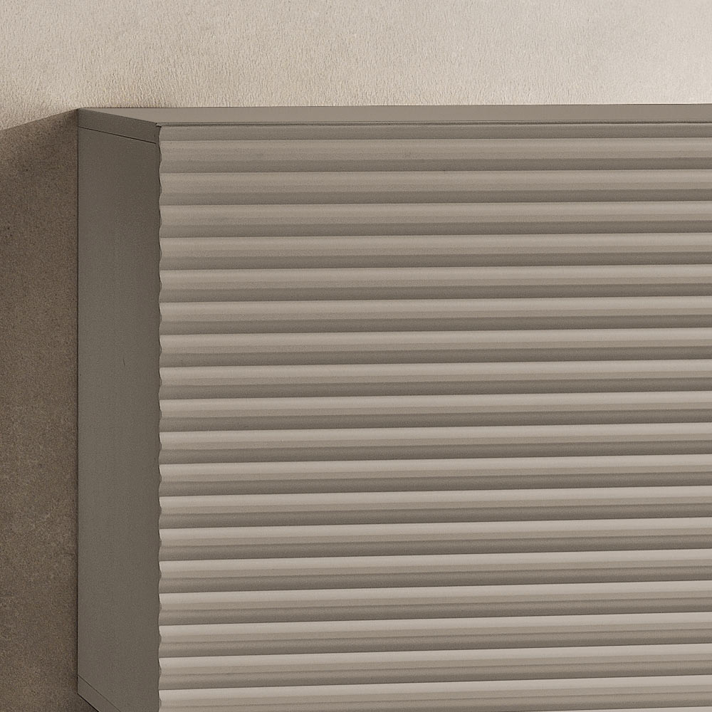 Drzwi z płyty MDF powlekanej PVC charakteryzują się wypukłym, poziomym paskiem , który dodaje powierzchni głębi i dynamiki, tworząc elegancki efekt graficzny. Dopasowany korpus z melaminy dopełnia całość wyrafinowanym efektem ton w ton , nadając kompozycji harmonijny i nowoczesny charakter.