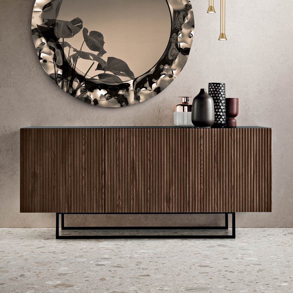 Elegancka , designerska komoda Made in Italy , idealna do stylowego wyposażenia salonu lub jadalni . Jej nowoczesny design wyróżnia się wyrazistą fakturą powierzchni, dzięki czemu komoda staje się wyrafinowanym, efektownym elementem dekoracyjnym.