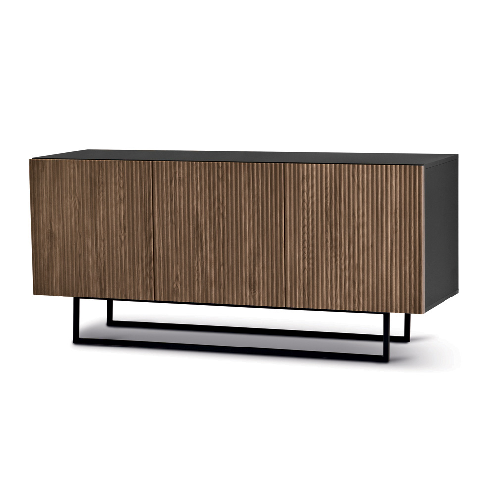 Designerska komoda wykonana we Włoszech z drzwiami ozdobionymi wypukłymi, pionowymi paskami i metalową podstawą.