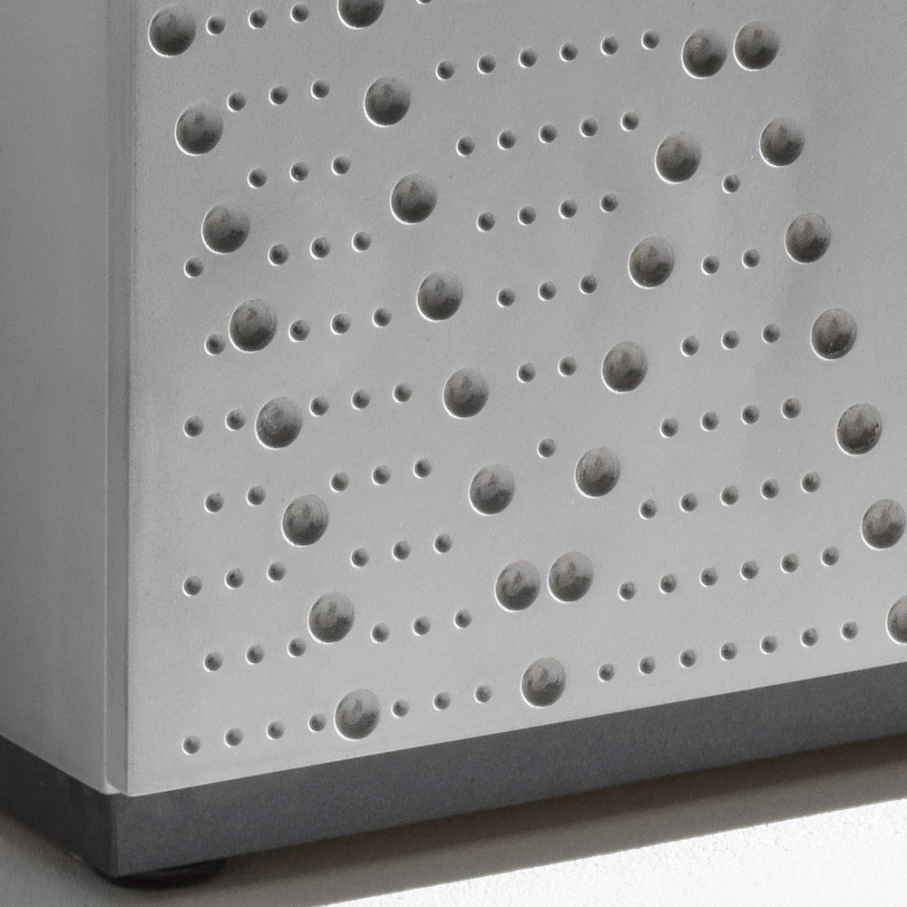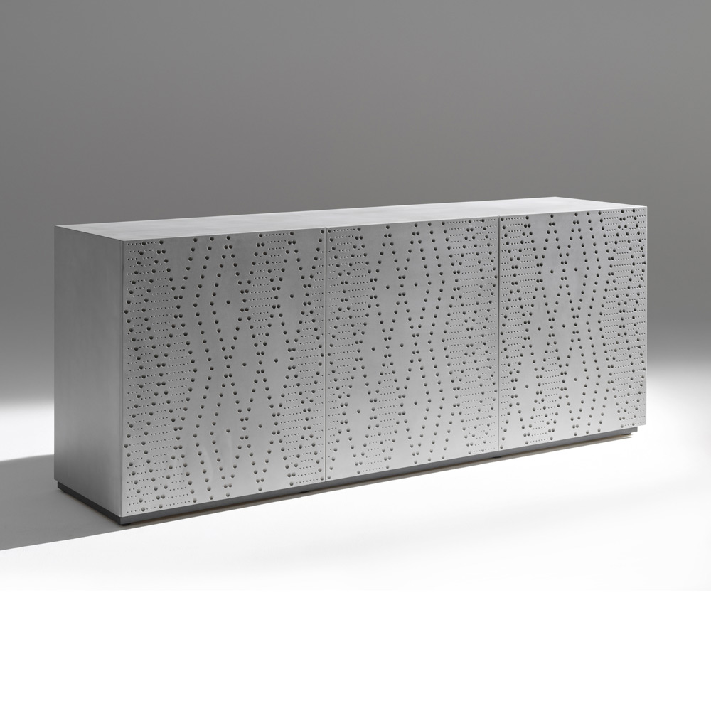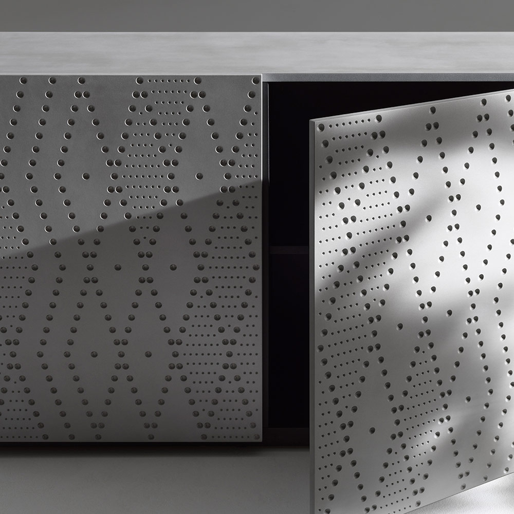 Kredens o wyrazistym, nowoczesnym charakterze, wyróżniający się wyrafinowaną , nakrapianą dekoracją z efektem odlewanego aluminium , pokrywającą drzwiczki i tworzącą wyrafinowaną grę światła i głębi. Efektowny mebel zaprojektowany z myślą o nowoczesnych, eleganckich i wyrafinowanych wnętrzach.