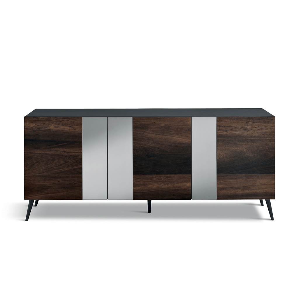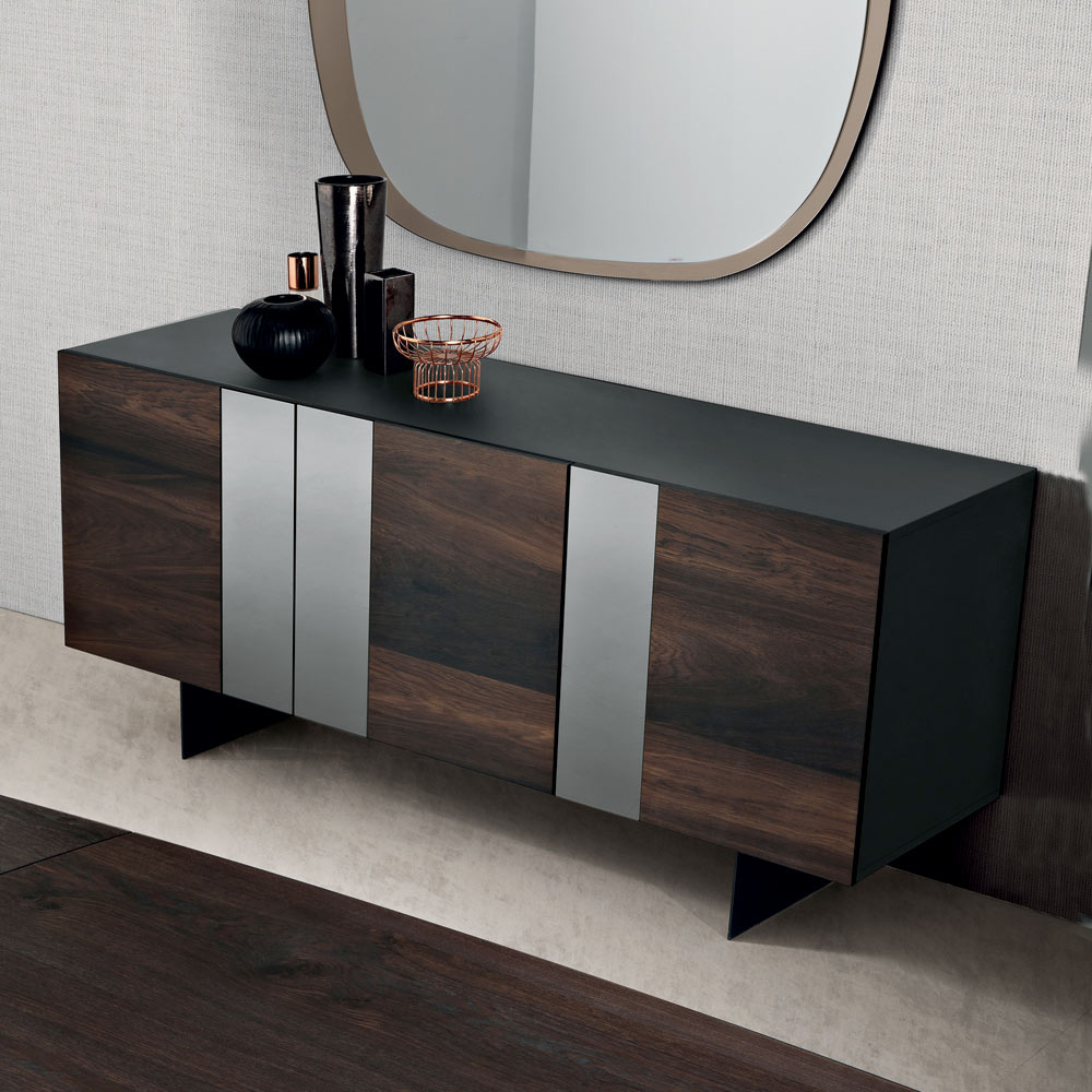 Antracytowa, pokryta melaminą obudowa kryje drzwi z forniru dębowego , podkreślone pionowymi, lustrzanymi wstawkami , które optycznie opływają kompozycję. Kontrast między fakturą drewna a odbiciami w lustrze nadaje komodzie głębi i dynamiki, nadając jej elegancji i dynamiki.