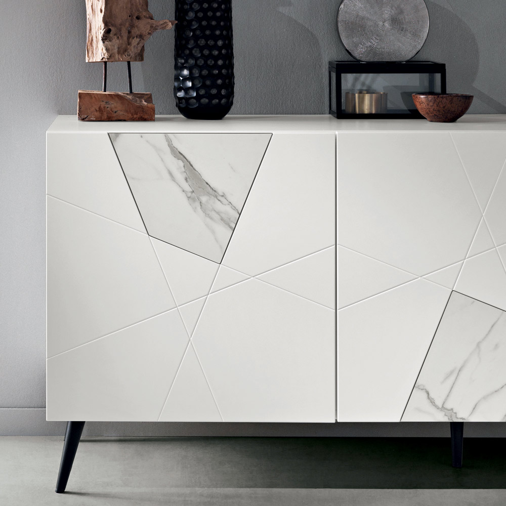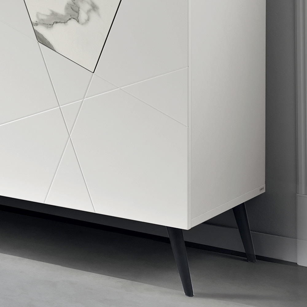 Konstrukcja składa się z drewnianej ramy pokrytej melaminą oraz drzwi z płyty MDF z pantografią , ozdobionych dekoracyjnymi grawerunkami, które przecinają się w eleganckim, geometrycznym wzorze. Wstawki ze szkła imitującego marmur wzbogacają powierzchnię, tworząc wyrafinowaną grę grafiki i materiałów.