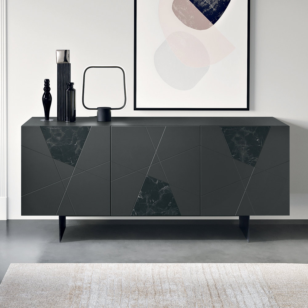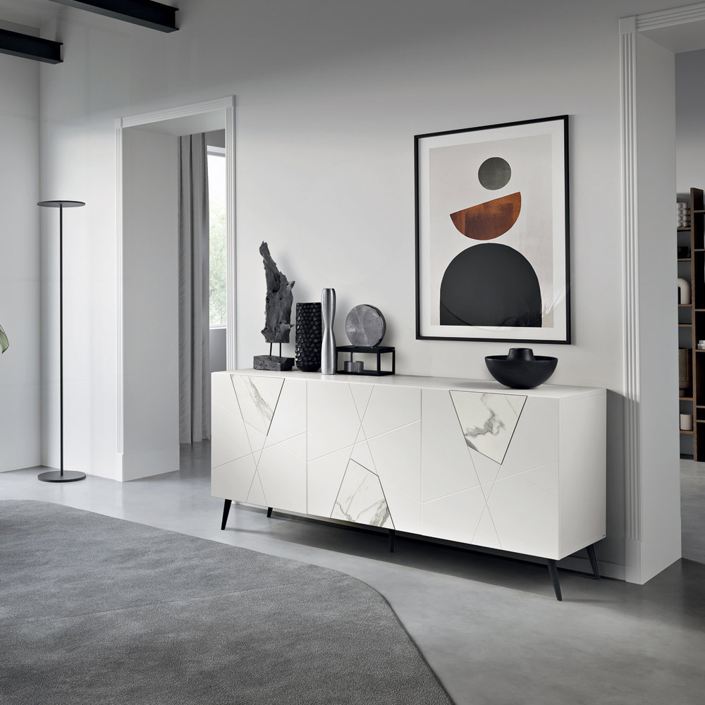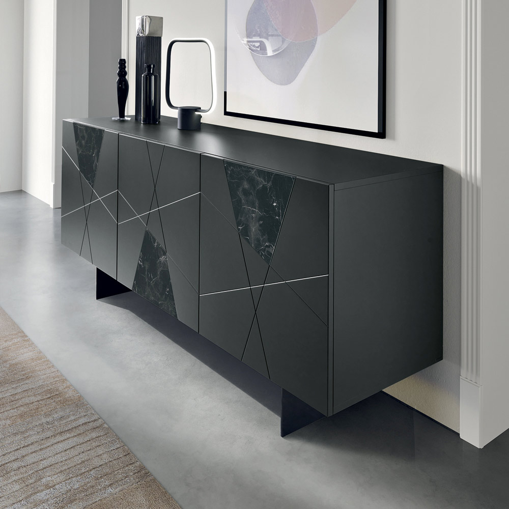 Dostępne wykończenia nadają kompozycji równowagę i elegancję, dzięki czemu kredens idealnie pasuje do nowoczesnych i wyrafinowanych wnętrz. Podstawa lekko unosi konstrukcję, zapewniając stabilność i nowoczesny wygląd.
