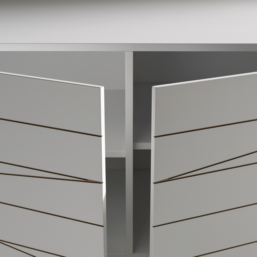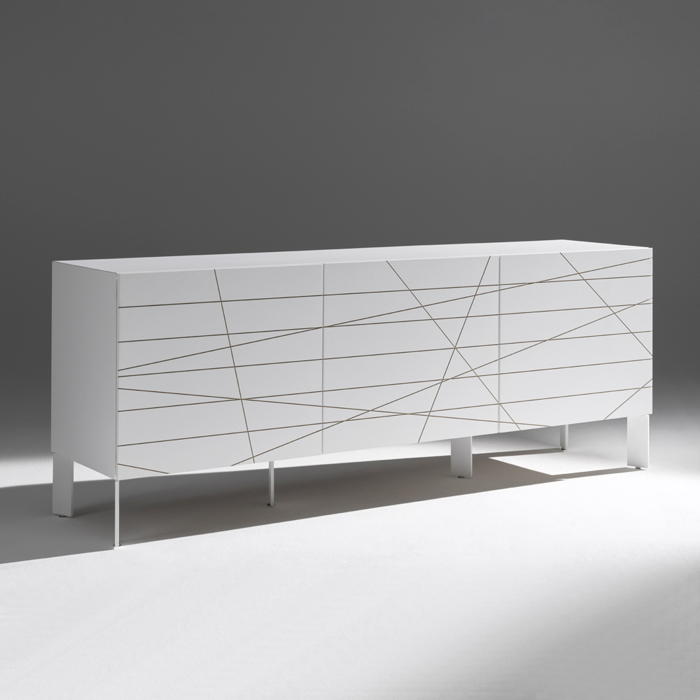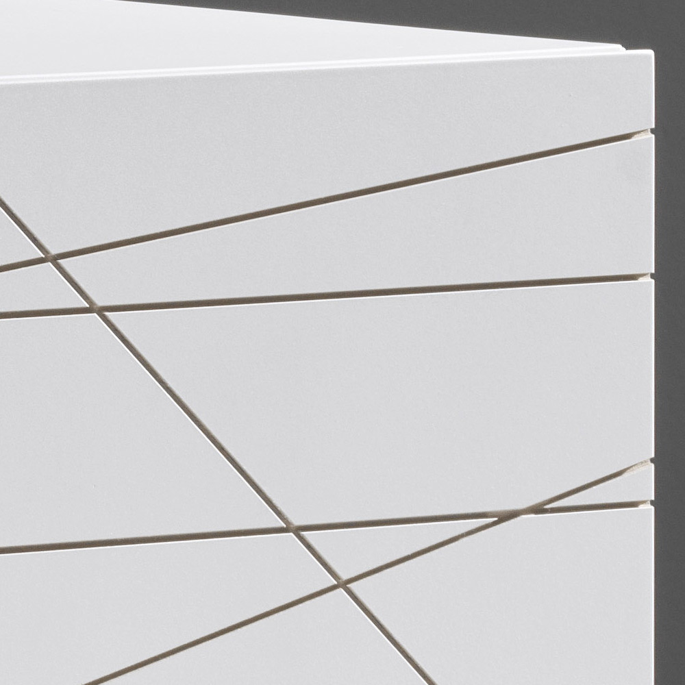 Efektowna wizualnie komoda, zaprojektowana z myślą o nowoczesnych i designerskich wnętrzach. Drzwi zdobi wyrafinowany, grawerowany wzór graficzny, który tworzy dynamiczne sploty linii i dodaje powierzchni ruchu, przekształcając mebel w prawdziwie dekoracyjny element.