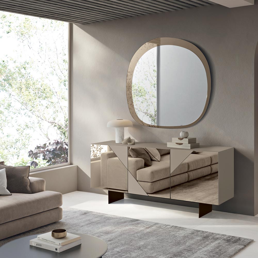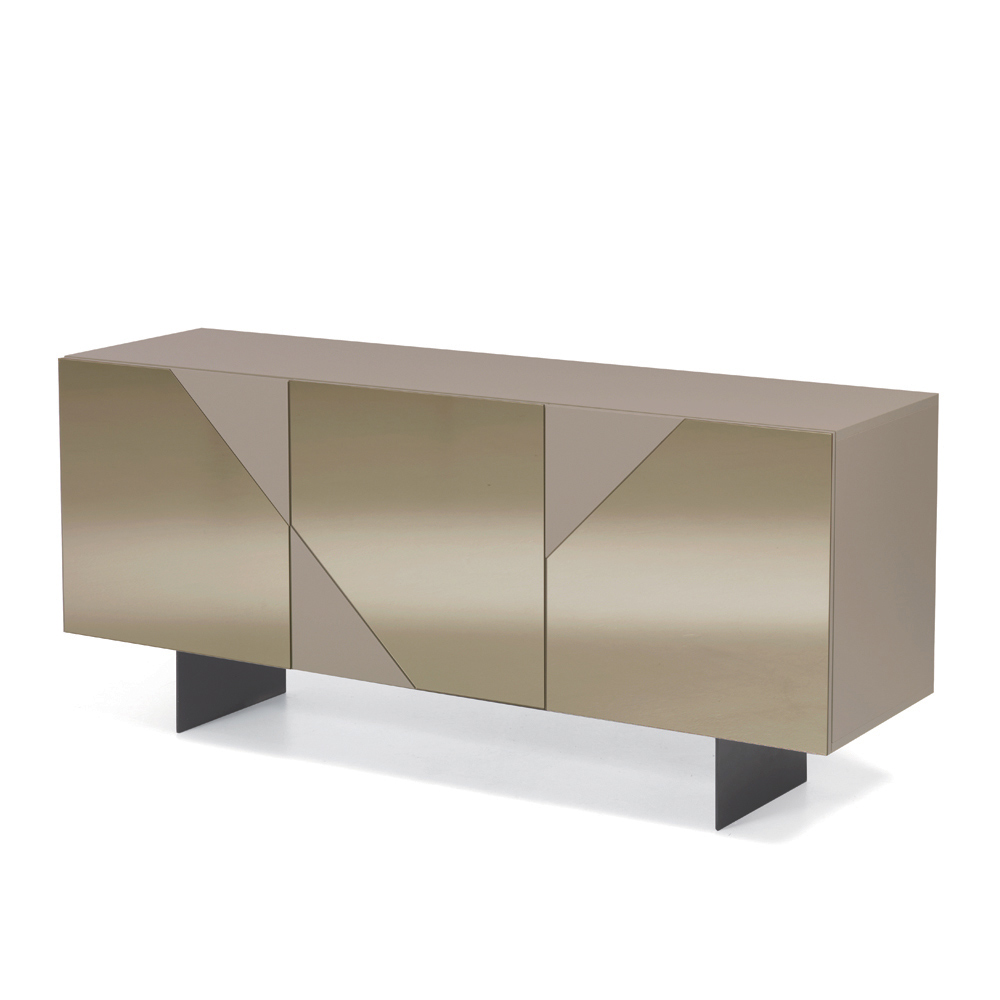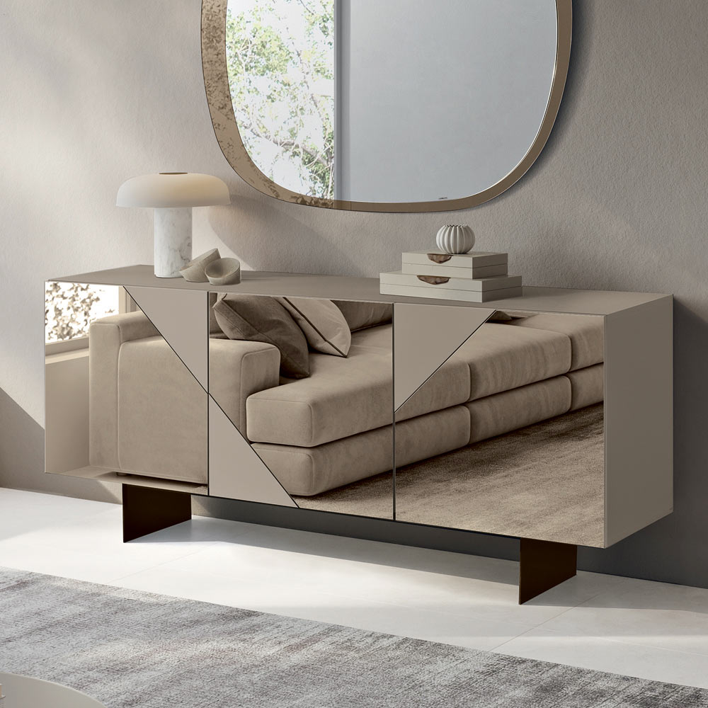 Drzwi z płyty MDF pokryte są lustrzanym szkłem , którego błyszczące i matowe powierzchnie naprzemiennie tworzą wyrafinowaną, geometryczną grę, która odbija światło i dodaje wizualnej głębi. Ten kontrastowy materiał sprawia, że komoda jest elegancka i dynamiczna, idealna do nowoczesnych i wyrafinowanych wnętrz.