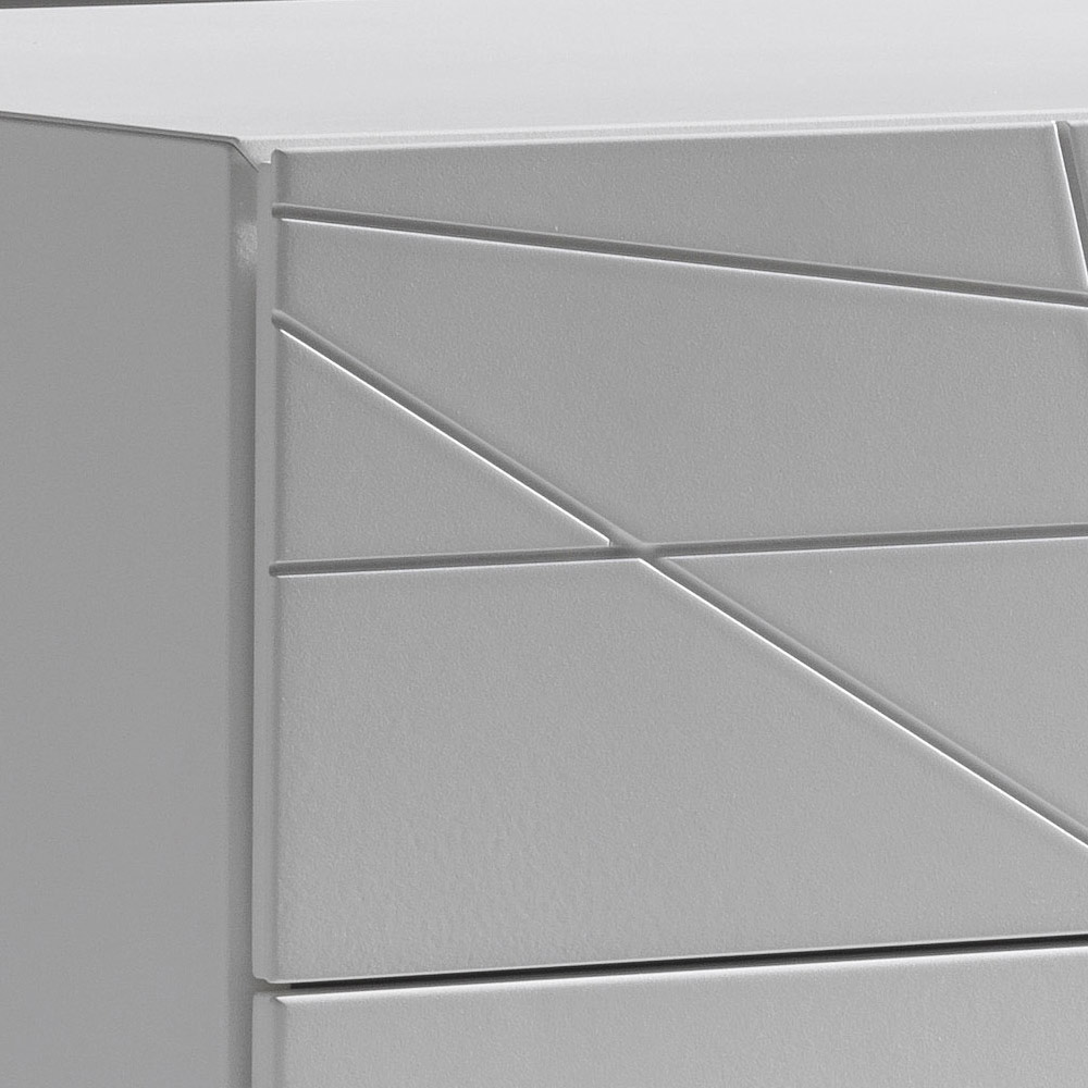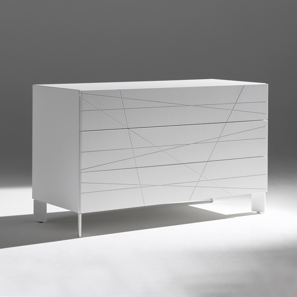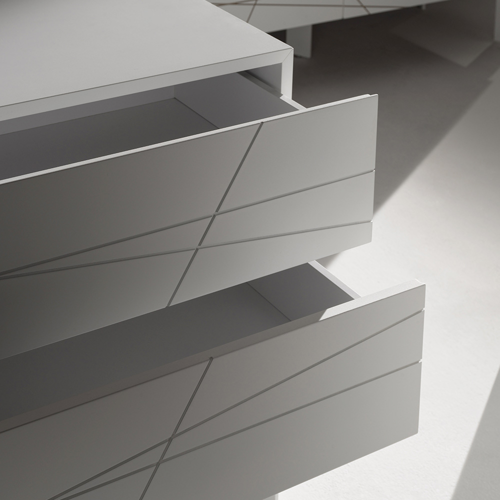Komoda o nowoczesnym, surowym wzornictwie, charakteryzująca się wyrazistą, graficzną tożsamością i czystymi liniami. Geometryczne nacięcia na frontach tworzą elegancką grę linii, która współgra ze światłem, czyniąc z niej prawdziwy element dekoracyjny w sypialni.
