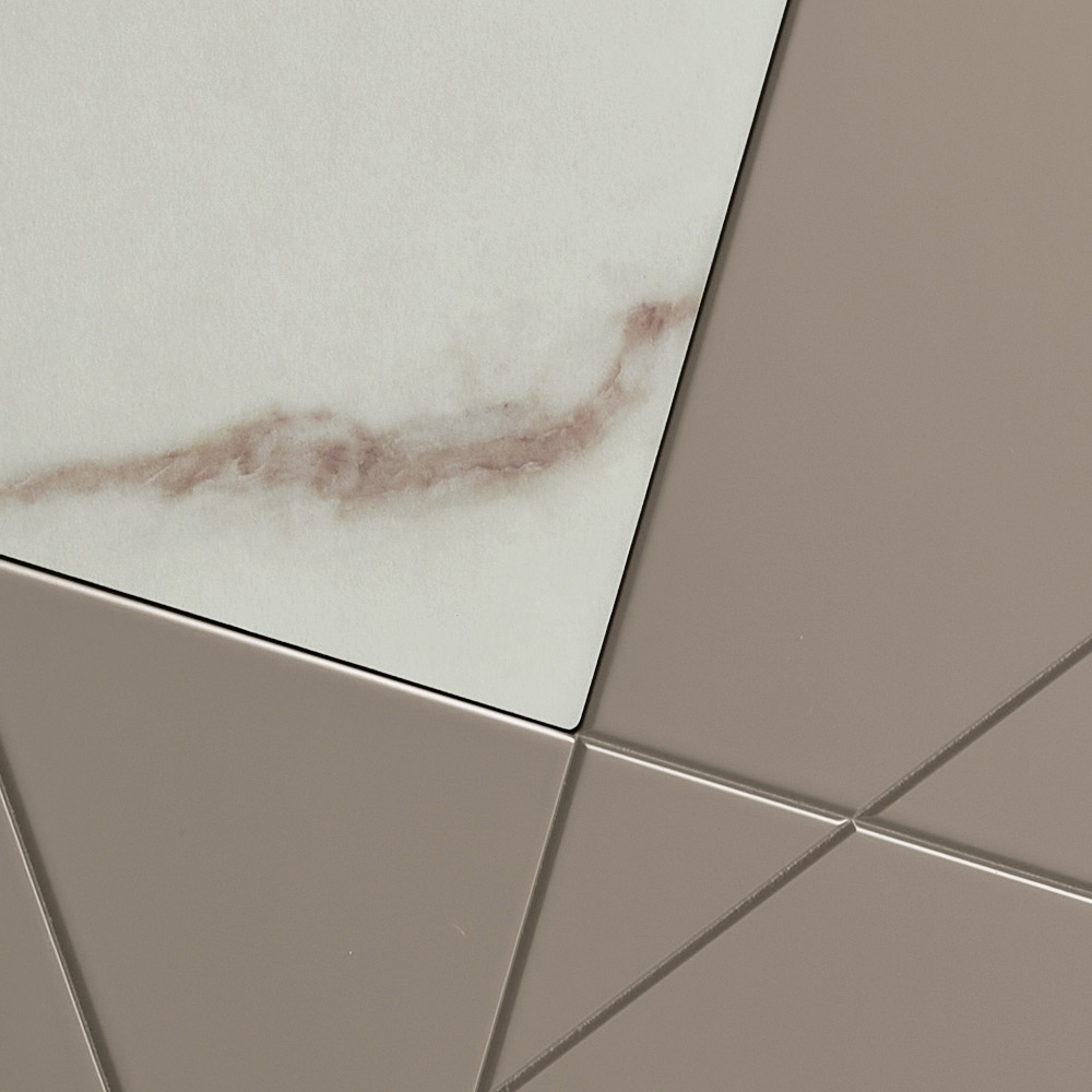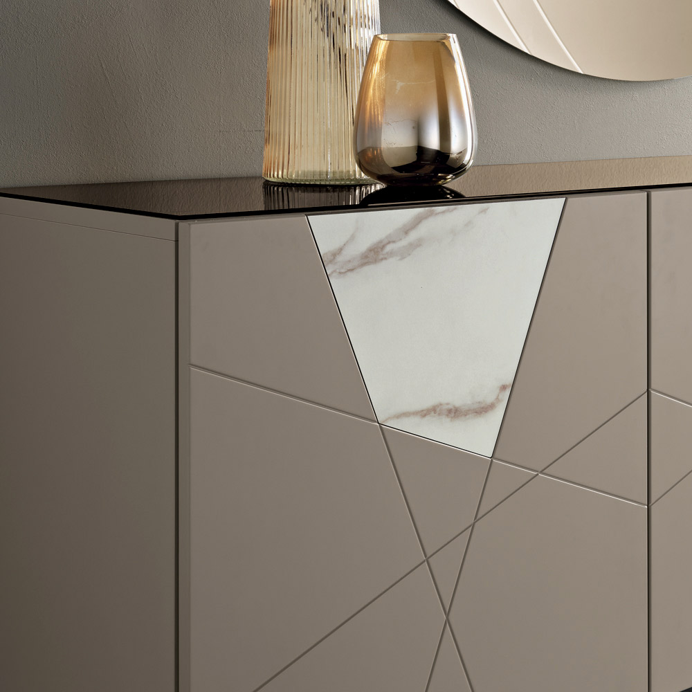 Konstrukcja składa się z drewnianej skorupy pokrytej melaminą, lustrzanego, szklanego blatu i drzwi z płyty MDF z pantografowanymi zdobieniami, które przeplatają się w elegancki, geometryczny wzór. Szklane wstawki imitujące marmur wzbogacają powierzchnię, tworząc wyrafinowaną grę grafiki i materiałów.