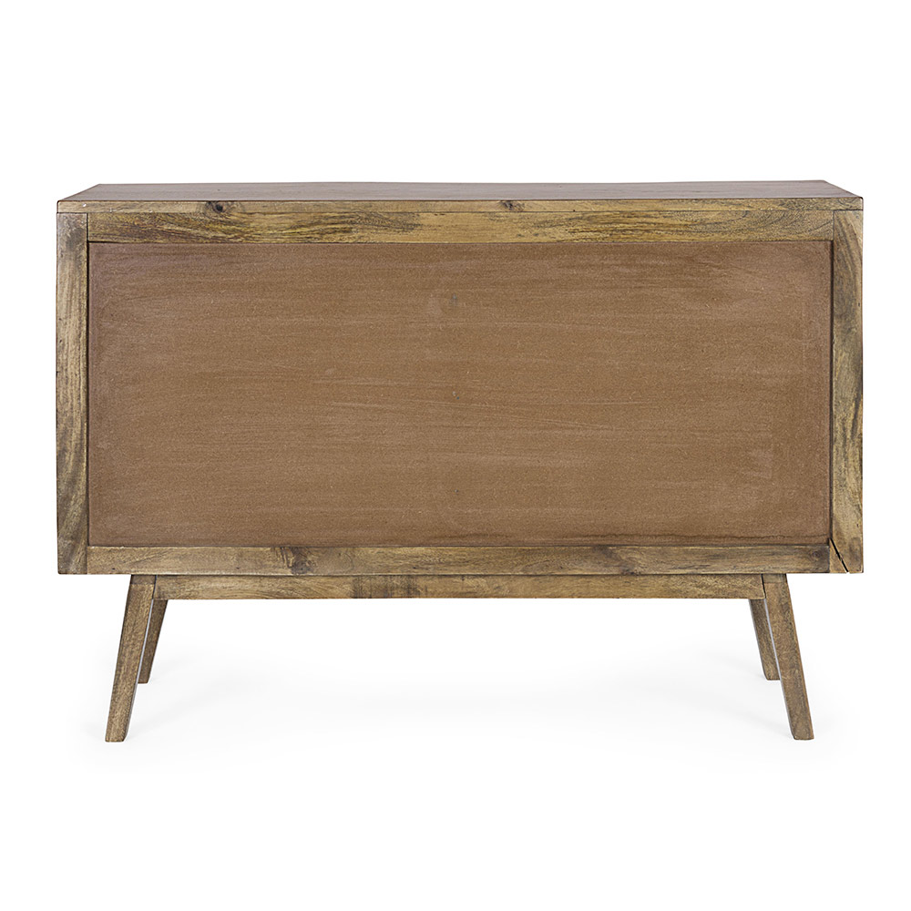 Ta designerska komoda do salonu ma konstrukcję i nogi z drewna mango z wykończeniem na bazie wody, a tył z płyty MDF. Gałki są stalowe, a nogi do zamontowania. Rezultatem jest elegancki kawałek w stylu vintage.