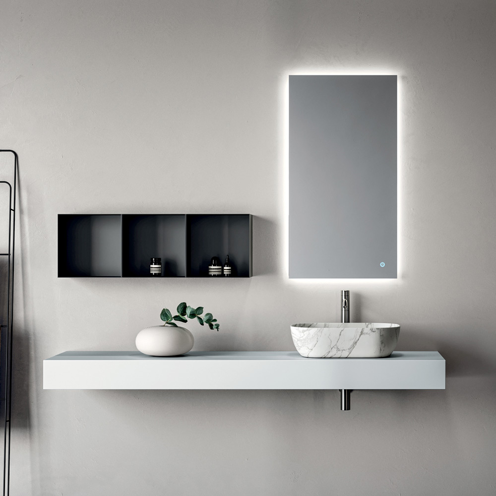 Podświetlane lustro dopełnia całość, oferując funkcjonalne i malownicze oświetlenie, idealne do upiększenia ściany i optycznego powiększenia przestrzeni.