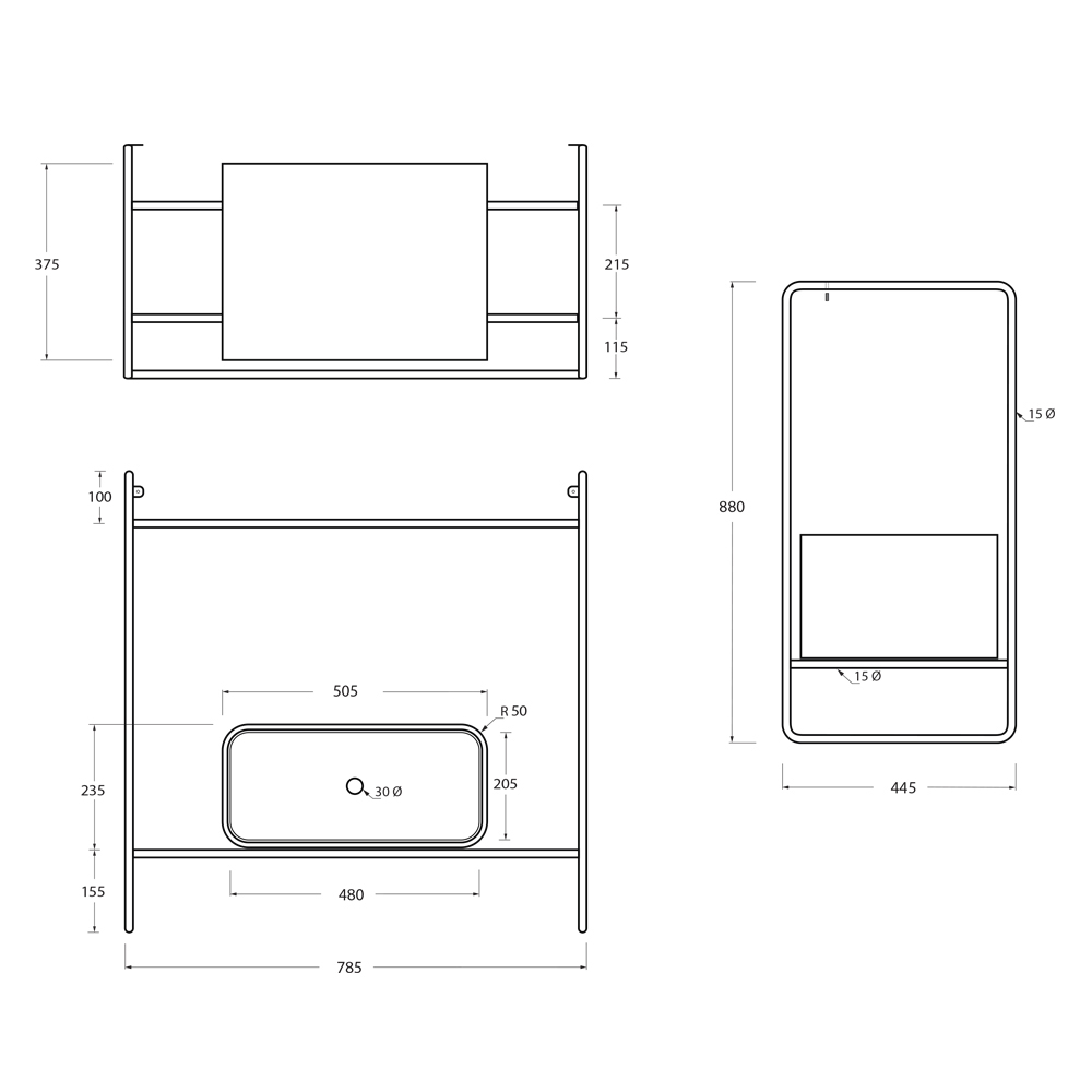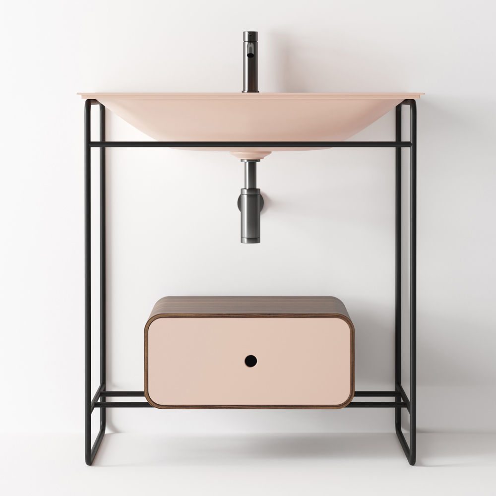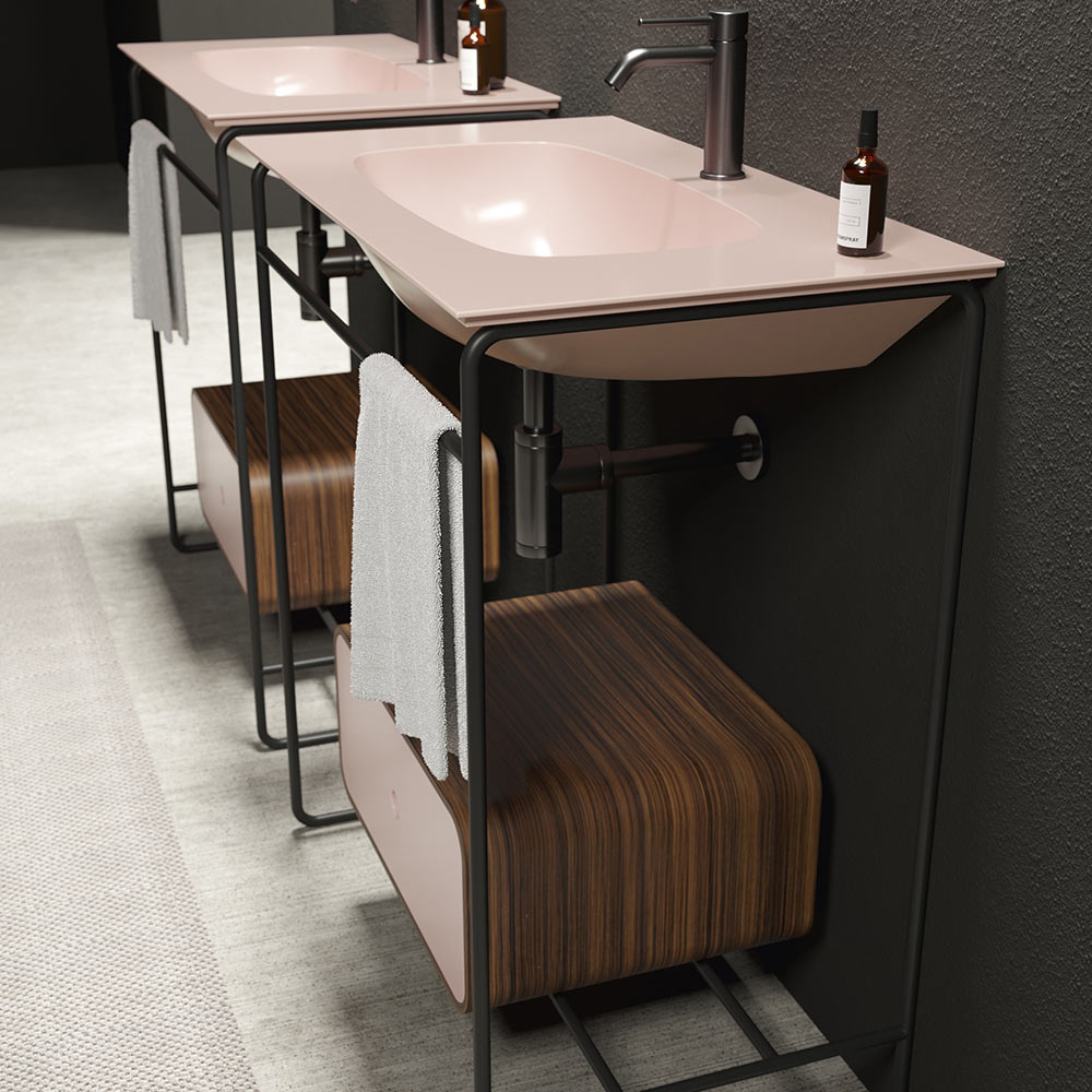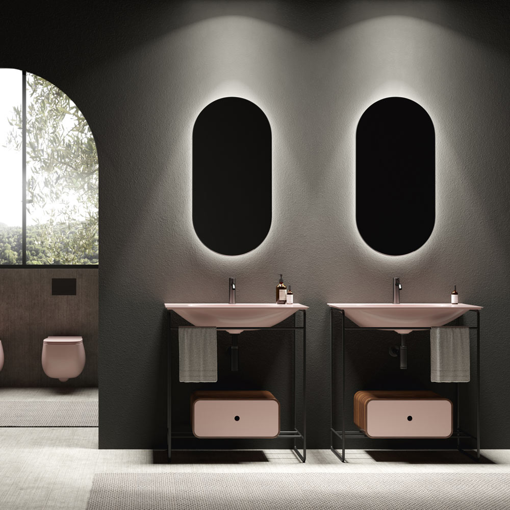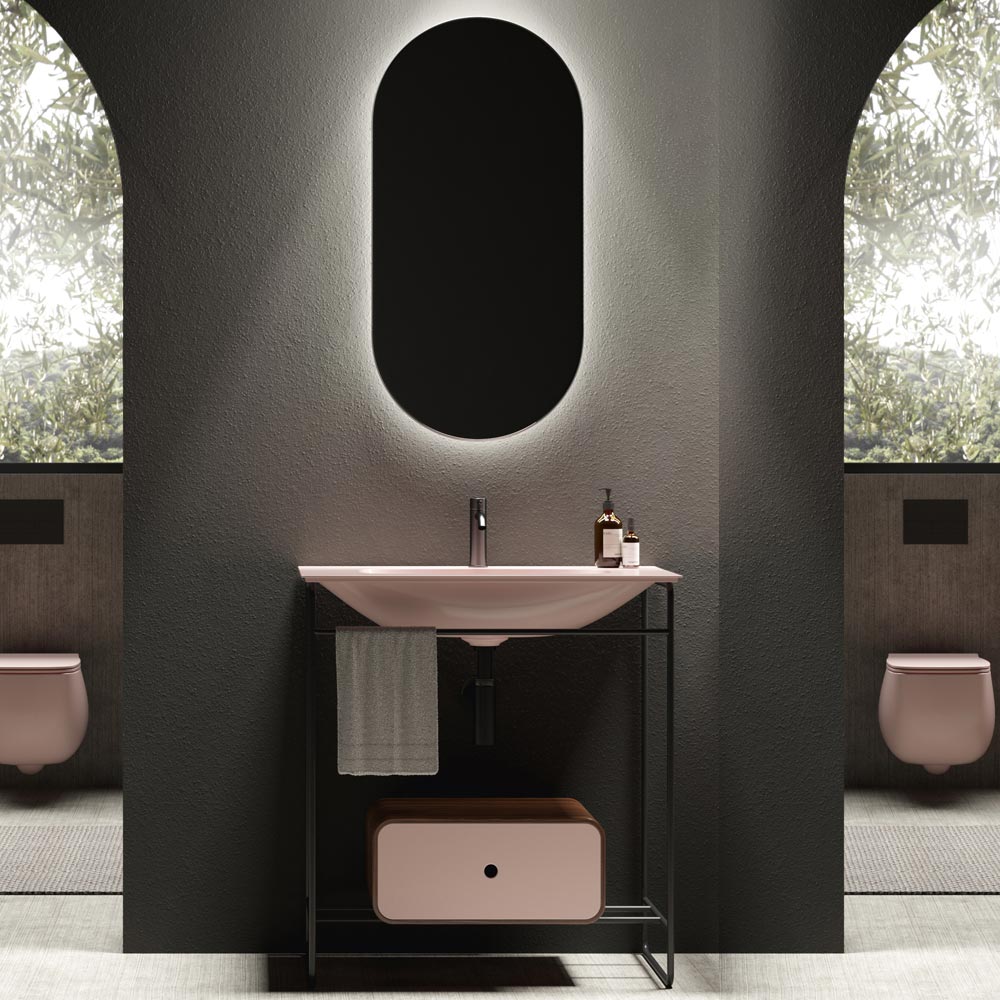 Kompozycja szafki łazienkowej złożona z ceramicznej umywalki z podstawą i lustrem. Umywalka charakteryzuje się rygorystyczną geometrią i miękkimi detalami, które tworzą wyrafinowaną i wyrafinowaną atmosferę. Podstawa ma konstrukcję ze stali nierdzewnej w czarnym matowym wykończeniu z drewnianą szufladą w kolorze hebanowym i frontem w tym samym kolorze co umywalka, podczas gdy owalne lustro jest podświetlone aluminiową ramą w czarnym matowym wykończeniu.