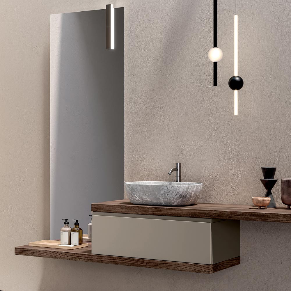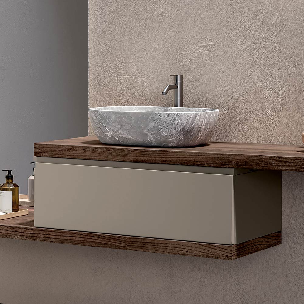 Kompleksowe rozwiązanie łazienkowe zaprojektowane dla tych, którzy poszukują nowoczesnej, podwieszanej szafki łazienkowej , charakteryzującej się ciepłymi wykończeniami, delikatnymi kontrastami i silną tożsamością estetyczną.