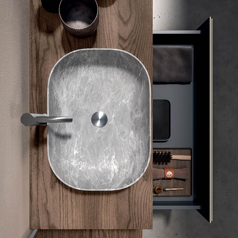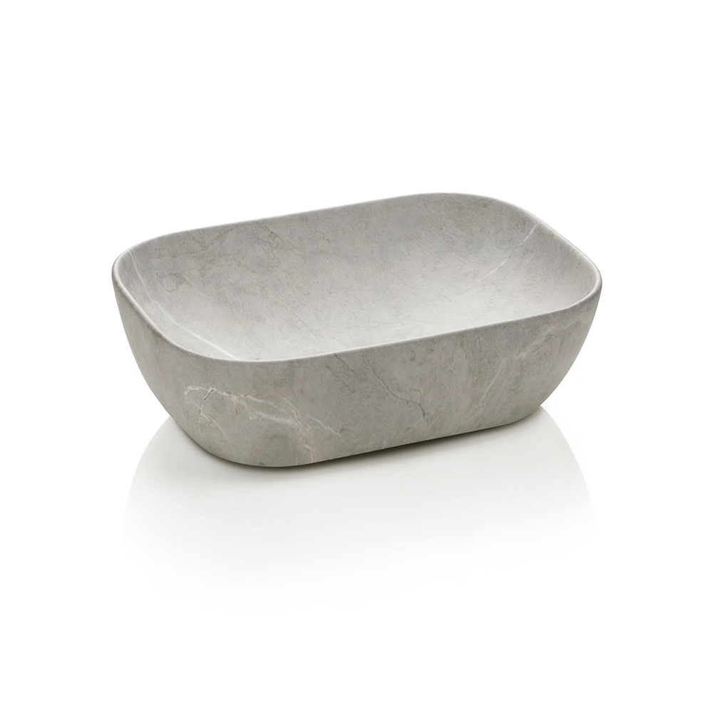 Szara, ceramiczna umywalka z kamienia dodaje odrobinę wyrafinowania: kompaktowa, funkcjonalna i doskonale wkomponowana w kompozycję, łączy w sobie wytrzymałość i styl w jednym elemencie.