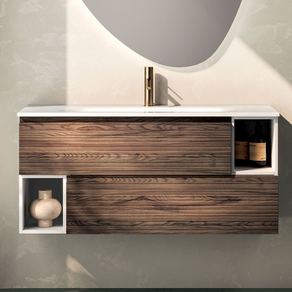 Elegancka, podwieszana kompozycja łazienkowa łącząca ciepło drewna z czystymi, współczesnymi liniami, zaprojektowana z myślą o wyrafinowanych przestrzeniach o silnym charakterze.