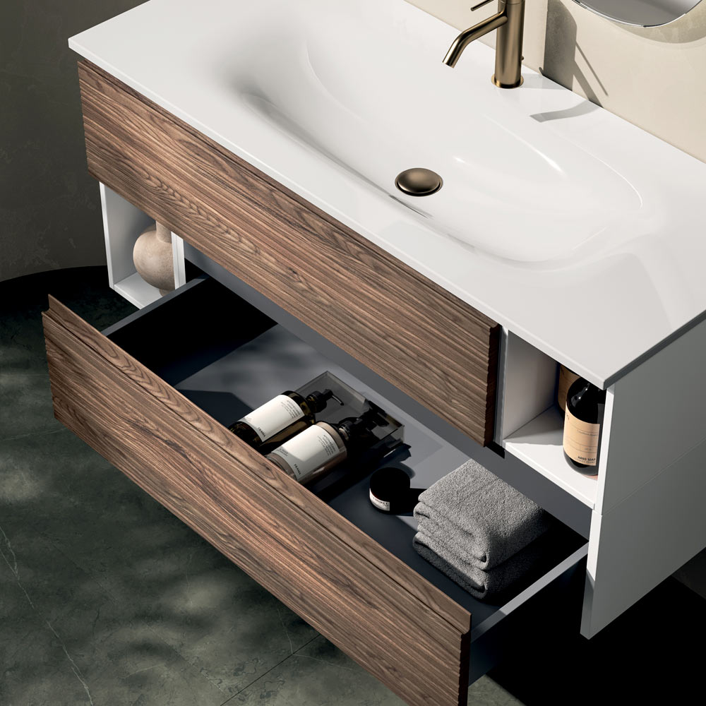 Propozycja designerskich mebli łazienkowych idealna dla osób poszukujących równowagi między współczesną estetyką, naturalnymi materiałami i zaawansowaną funkcjonalnością, która przekształci łazienkę w elegancką, przyjazną przestrzeń o silnej osobowości.