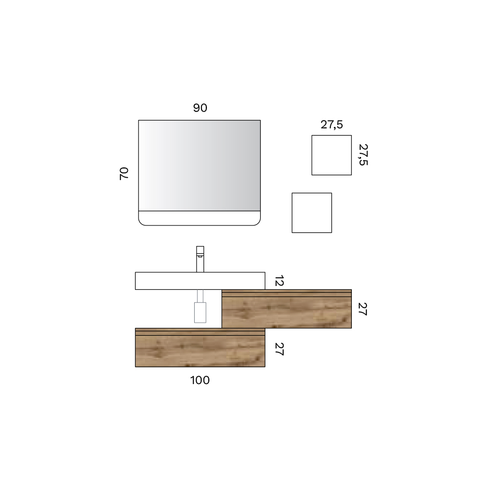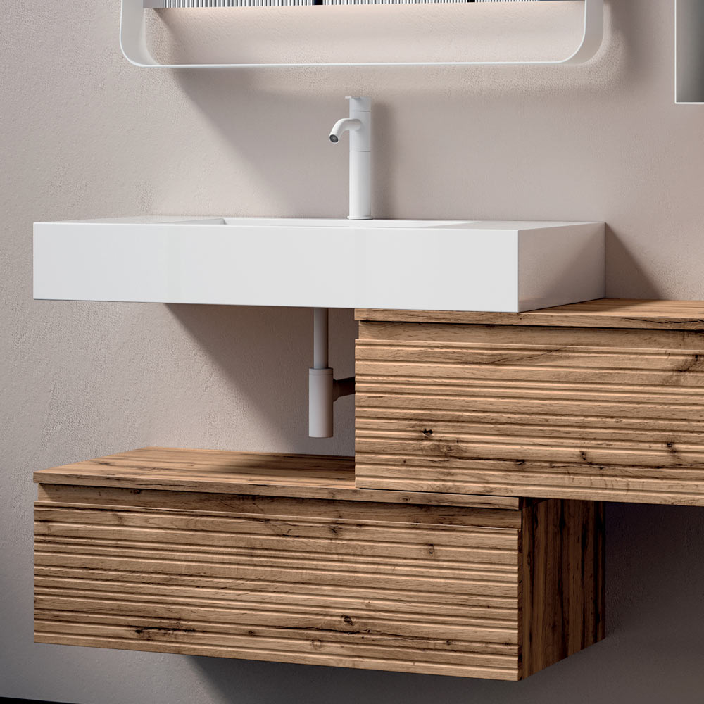 Elegancka, podwieszana kompozycja łazienkowa łącząca ciepło naturalnego drewna z nowoczesnymi liniami, idealna do nowoczesnych i wyrafinowanych łazienek.