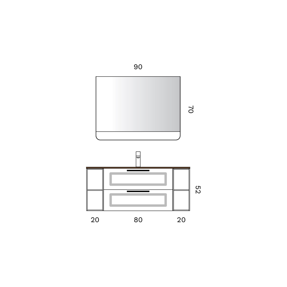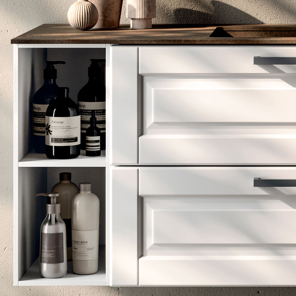 Wisząca szafka dolna z podwójną szufladą i otwartymi przegródkami wyróżnia się czystymi liniami i minimalistycznym wzornictwem, zaprojektowanym z myślą o zapewnieniu równowagi wizualnej i codziennej funkcjonalności. Zintegrowany zlew kamionkowy podkreśla powierzchnię głębokim, teksturowanym efektem, inspirowanym naturalnymi odcieniami oksydowanych metali.