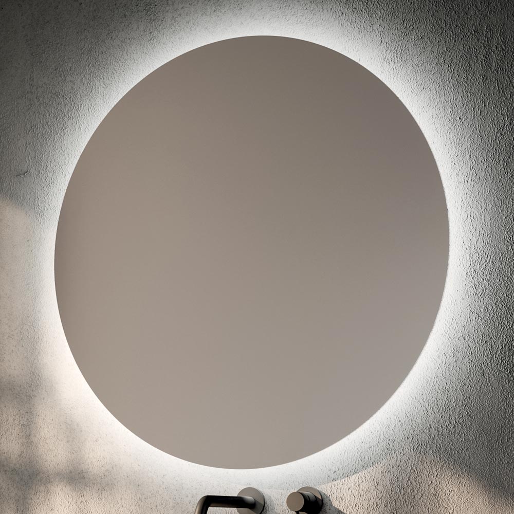 Okrągła umywalka z żywicy o miękkim, minimalistycznym profilu idealnie komponuje się z blatem, natomiast podświetlane lustro wzmacnia jasność i nadaje ścianie wizualną głębię, pomagając stworzyć relaksującą, nowoczesną atmosferę.