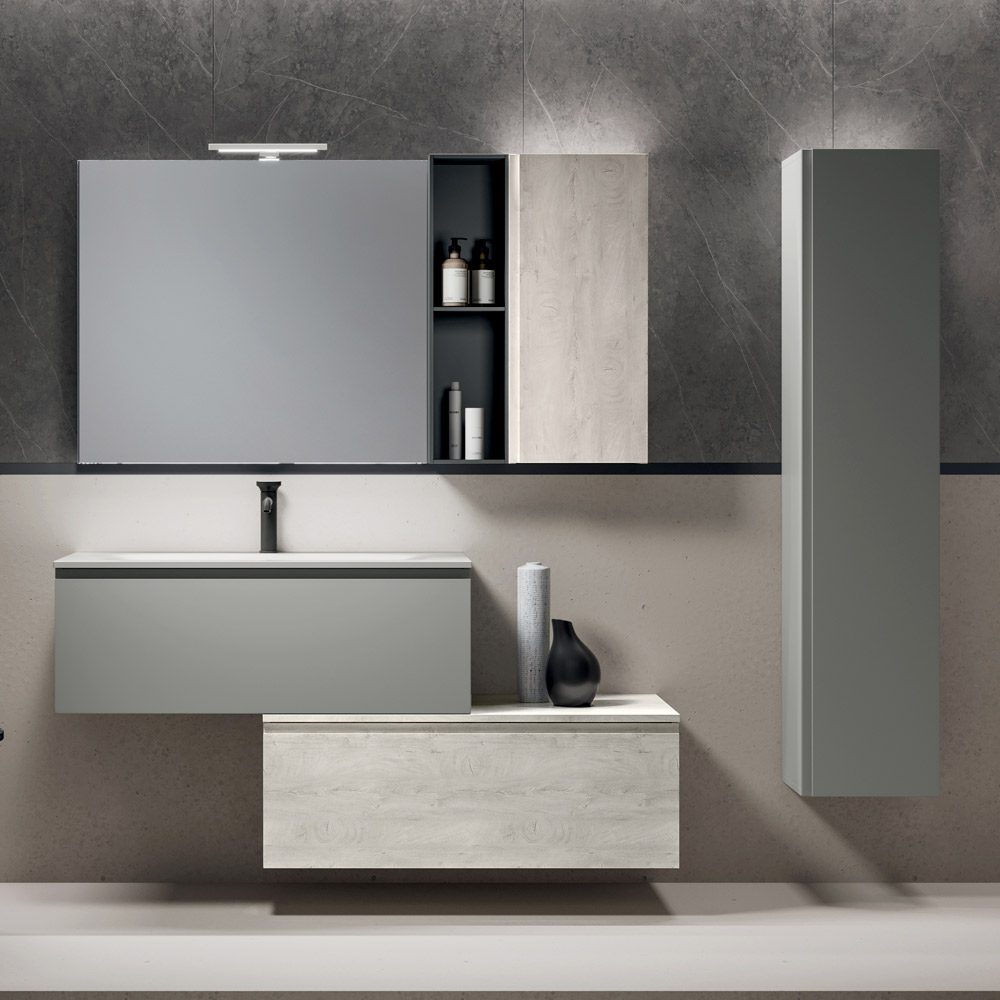Zawieszona ściana w wykończeniu w kolorze dębu alaskańskiego i otwarty element w kolorze antracytowym wzbogacają konstrukcję o funkcjonalne i dekoracyjne rozwiązania, idealne do uporządkowania i spersonalizowania przestrzeni łazienki, zapewniając elegancję i praktyczność.