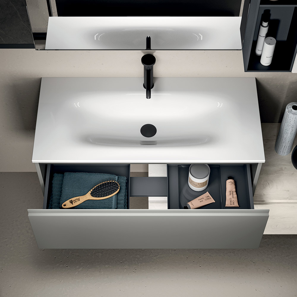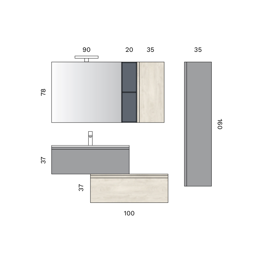 Kompozycja interpretuje współczesne wyposażenie łazienek za pomocą minimalistycznego języka architektonicznego, gdzie solidne bryły i otwarte przestrzenie współistnieją w idealnej równowadze. Odważny projekt, idealny do nowoczesnych i eleganckich wnętrz.