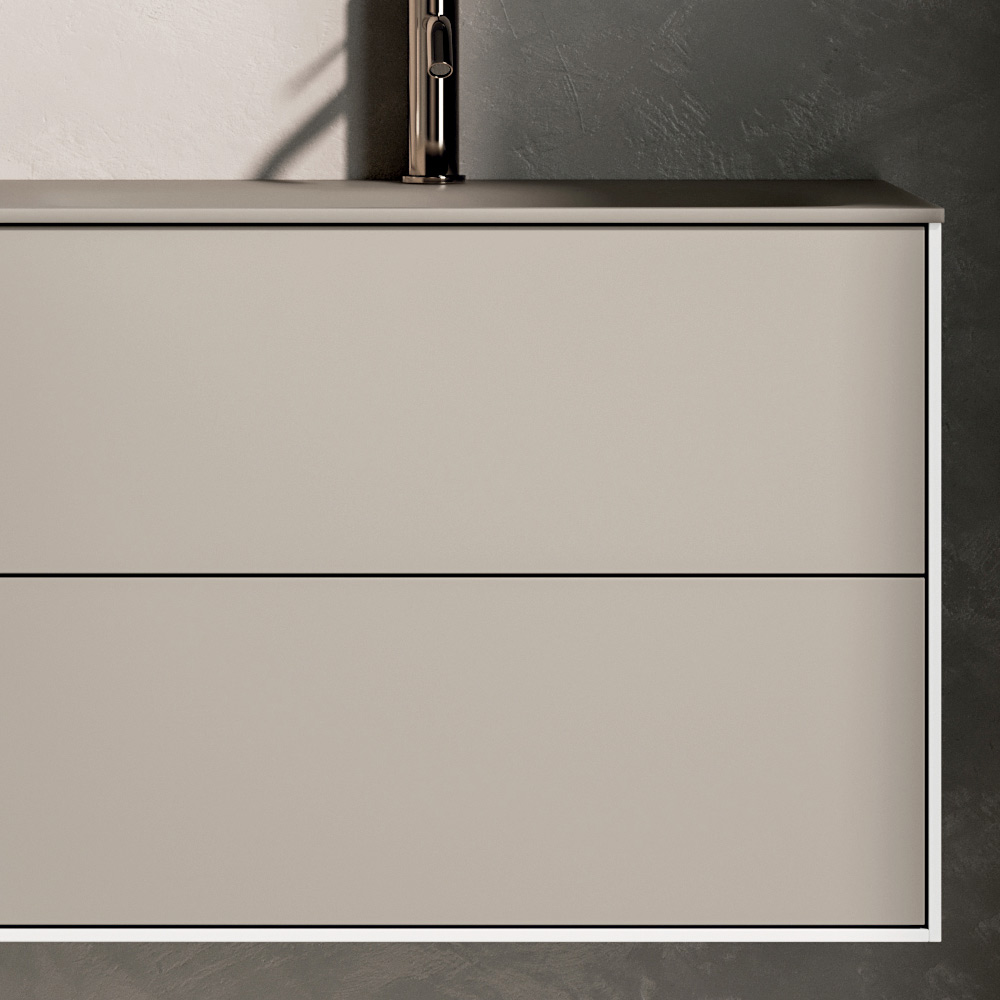 Centralnym punktem strefy umywalkowej jest gołębioszary, matowy szklany zlew , wyrafinowane rozwiązanie łączące w sobie wizualną lekkość i nowoczesny styl. Matowa powierzchnia wzmacnia światło i tworzy wyrafinowany efekt.
