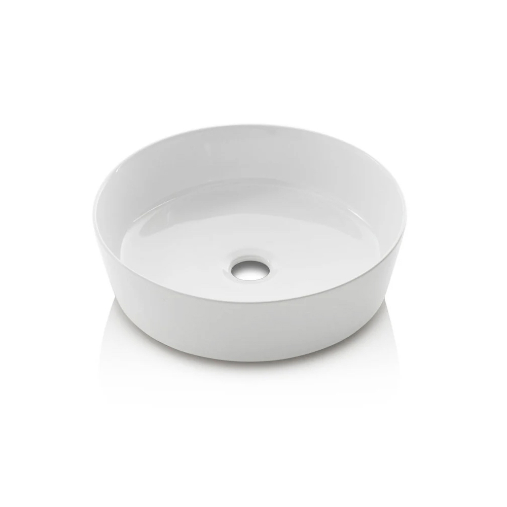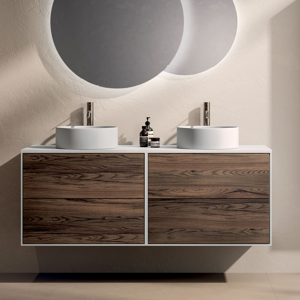 Okrągłe, lśniąco białe ceramiczne umywalki elegancko wyłaniają się z powierzchni, podkreślając wizualną lekkość całości i oferując idealne rozwiązanie do przestrzeni wspólnych. Miękkie kształty harmonijnie współgrają z czystymi liniami szafki wiszącej.
