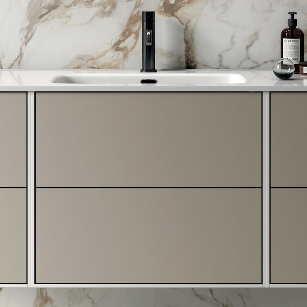 Proste linie i czyste bryły podkreślają przestrzeń, a zawieszona konstrukcja nadaje jej optycznej lekkości i wyrafinowanego efektu architektonicznego. Szuflady zapewniają praktyczność i porządek, zachowując minimalistyczny i harmonijny charakter.