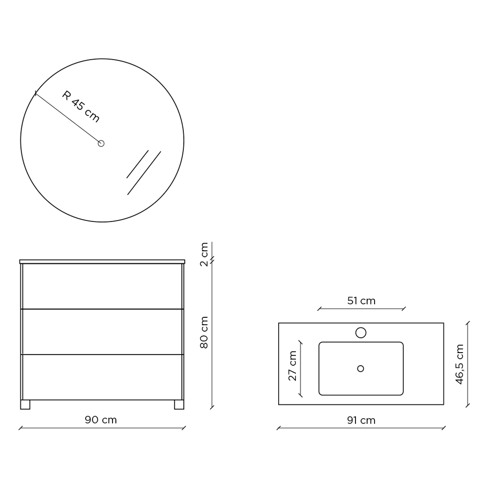 Wymiary: Umywalka: dł. 51 cm x gł. 27 cm Podstawa: dł. 90 cm x gł. 46,5 cm x wys. 82 cm Lustro: R 45cm
