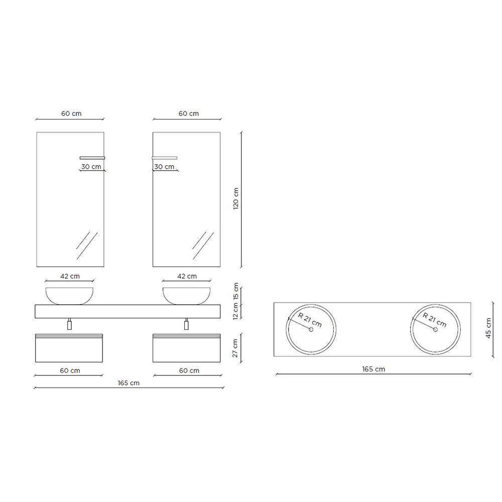 Kompozycja łazienkowa składająca się z: 2 umywalek z matowej białej żywicy spoczywających na dębowym blacie w kolorze miodowym, 2 podstaw z błyszczącej białej , odpornej na zarysowania melaminy i 2 luster z lampą LED.