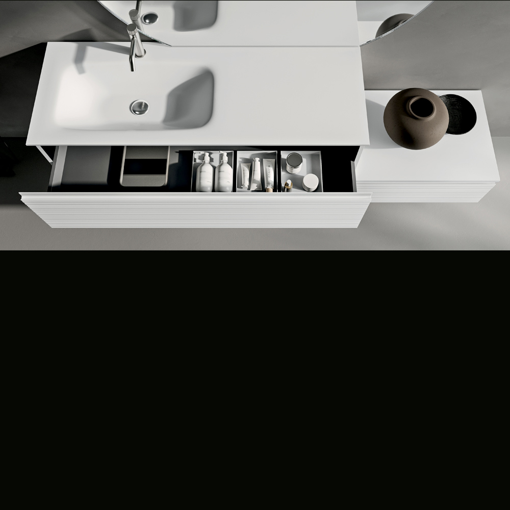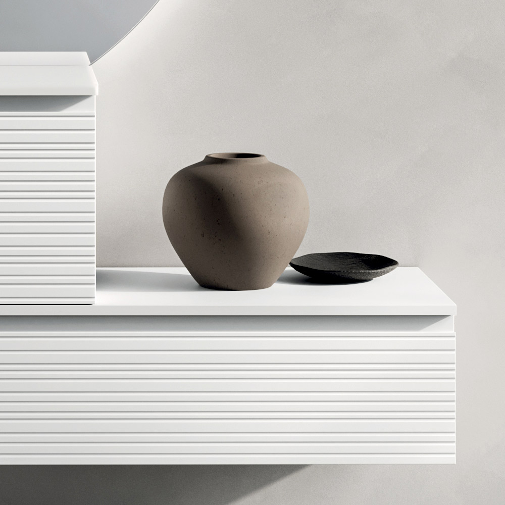 Matowo-biała, wisząca szafka łazienkowa charakteryzuje się czystymi liniami i zrównoważonymi proporcjami, oferując funkcjonalne i dyskretne rozwiązanie do przechowywania. Matowe wykończenie podkreśla czystość koloru, dzięki czemu kompozycja idealnie nadaje się zarówno do wnętrz mieszkalnych, jak i luksusowych projektów kontraktowych.