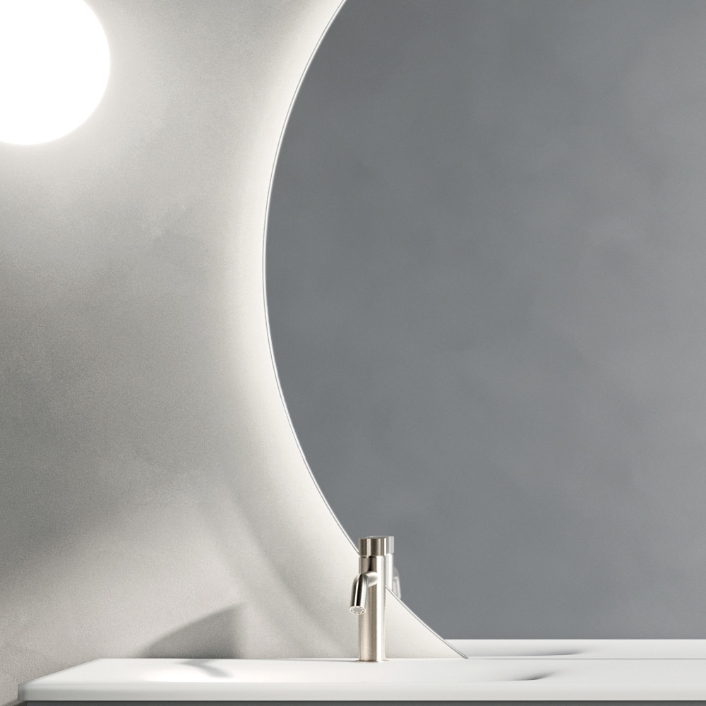 Całość dopełnia okrągłe lustro LED , które rozprasza miękkie, równomierne światło, zwiększając funkcjonalność obszaru wokół zlewu i pomagając stworzyć przyjazną, relaksującą atmosferę.
