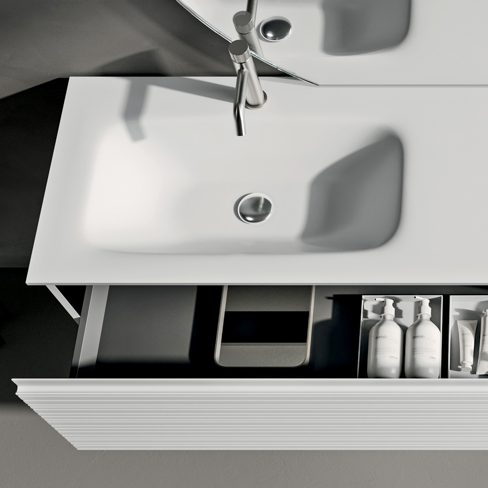 Elegancka, podwieszana kompozycja łazienkowa o prostym i współczesnym wzornictwie, zaprojektowana po to, aby wzbogacić nowoczesne przestrzenie o jasny i wyrafinowany styl.