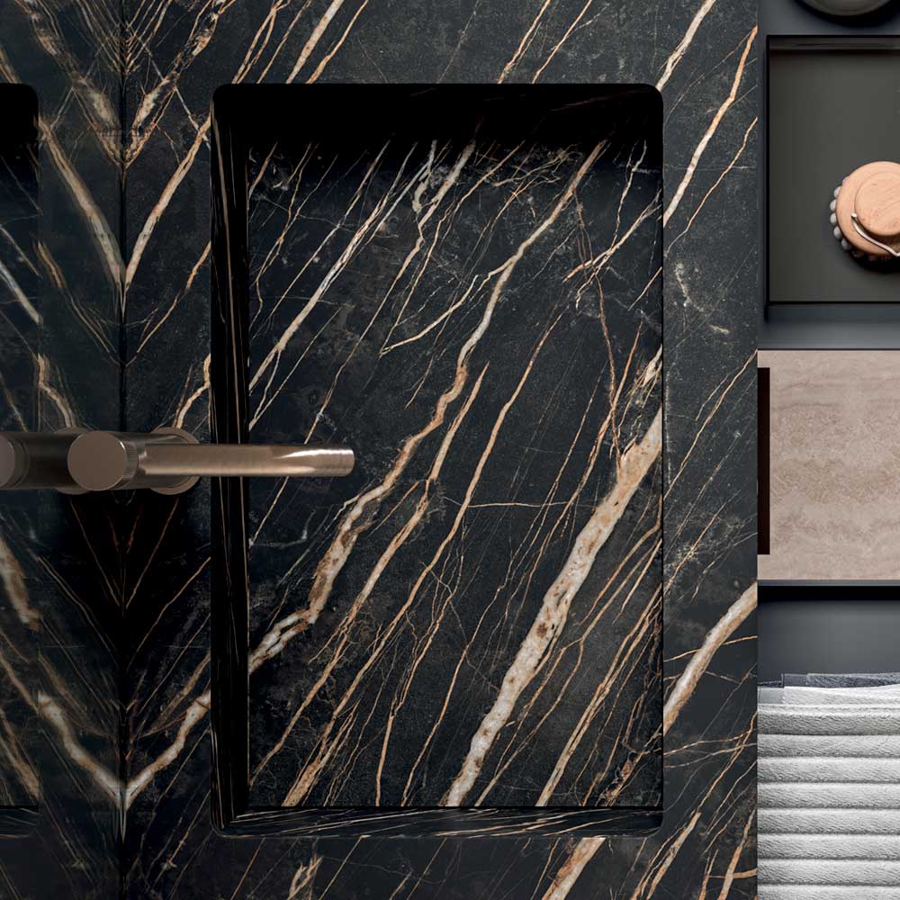 Kamionkowa umywalka nablatowa z wykończeniem imitującym ciemny kamień nadaje materiałowi silną tożsamość i gwarantuje wysoką wytrzymałość i trwałość, dzięki czemu idealnie nadaje się do codziennego użytku.