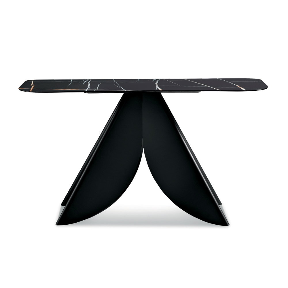 Konstrukcję charakteryzuje pomalowana metalowa podstawa, składająca się z czterech splecionych, wygiętych elementów przypominających kształtem płatki kwiatów, co tworzy wyrafinowany, dynamiczny i scenograficzny efekt graficzny.