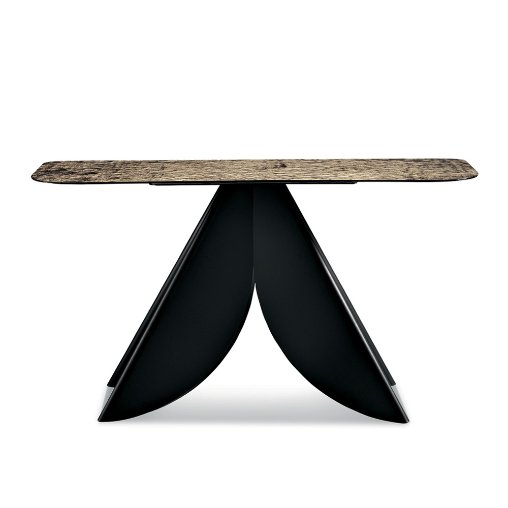 Konstrukcję charakteryzuje pomalowana metalowa podstawa, składająca się z czterech splecionych, wygiętych elementów przypominających kształtem płatki kwiatów, co tworzy wyrafinowany, dynamiczny i scenograficzny efekt graficzny.