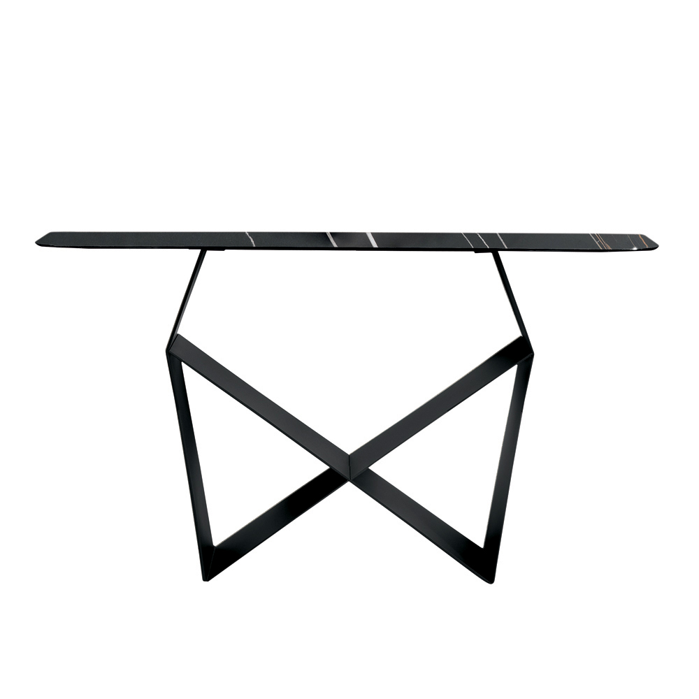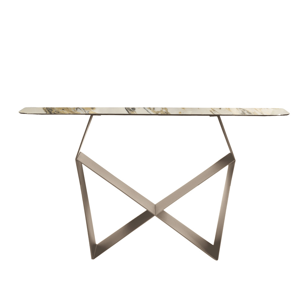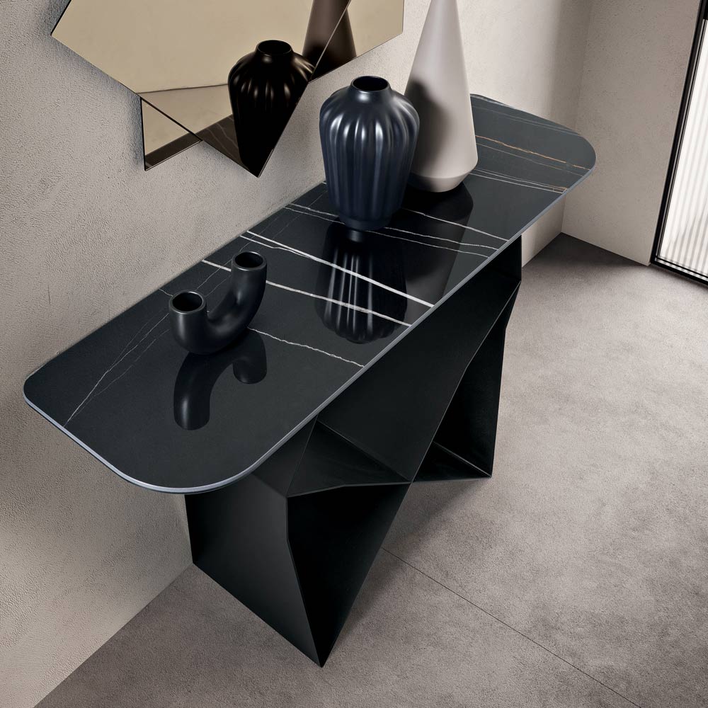Konstrukcja wyróżnia się malowaną metalową podstawą , która tworzy oryginalny kształt muszki , tworząc wyrafinowaną grę brył i pustych przestrzeni. Ten detal dodaje kompozycji dynamiki i rozmachu, nadając konsoli dramatyczny, a jednocześnie zrównoważony charakter.