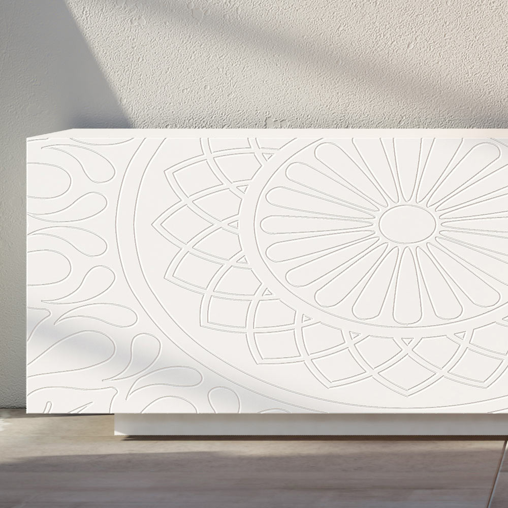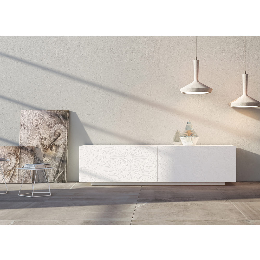 Nowoczesna komoda z białą matową lakierowaną strukturą MDF składającą się z 2 współpłaszczyznowych drzwi przesuwnych które gwarantują dużą funkcjonalność i praktyczność oraz z lakierowanego cokołu , który zapewnia dużą stabilność. Ten produkt jest pełen smaku i designu dzięki eleganckim i wyrafinowanym wykończeniom oraz płaskorzeźbionym dekoracjom drzwi, co czyni je wyjątkowymi w swoim rodzaju. Różnorodne materiały użyte do budowy zapewniają doskonałą jakość i wytrzymałość w czasie, nadając produktowi wyjątkowy i niezapomniany charakter.